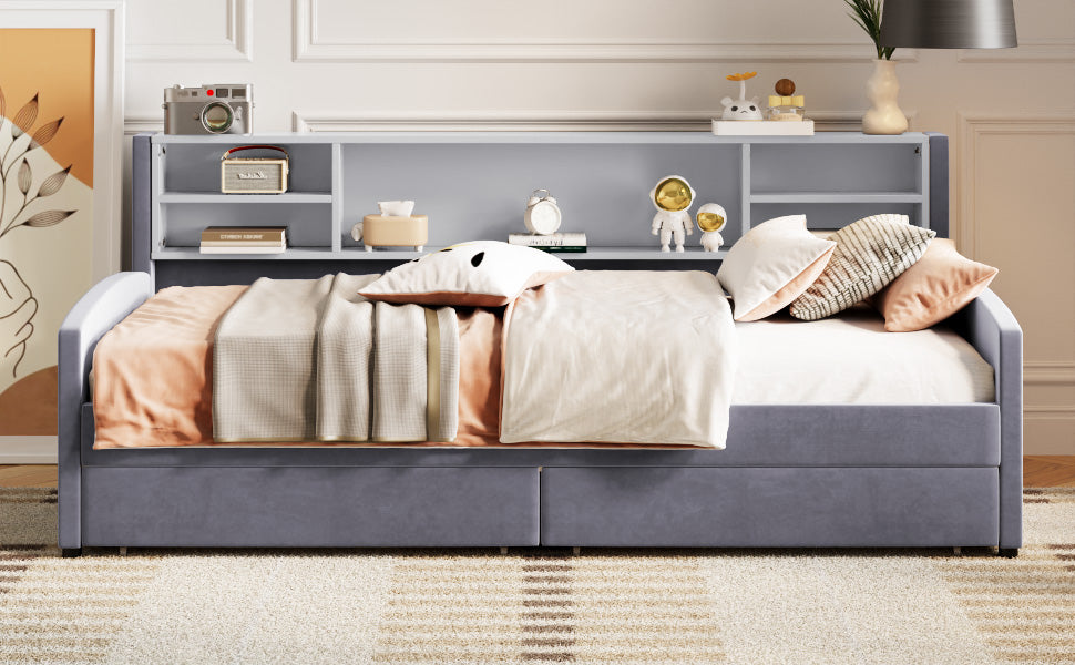 Sink into casual luxury with this twin upholstered platform bed—designed to blend comfortable support, smart storage, and clean-lined style. The plush velvet headboard creates a cozy backrest for reading or watching TV, while under-bed drawers and a built-in cabinet maximize storage in smaller bedrooms without sacrificing aesthetics.