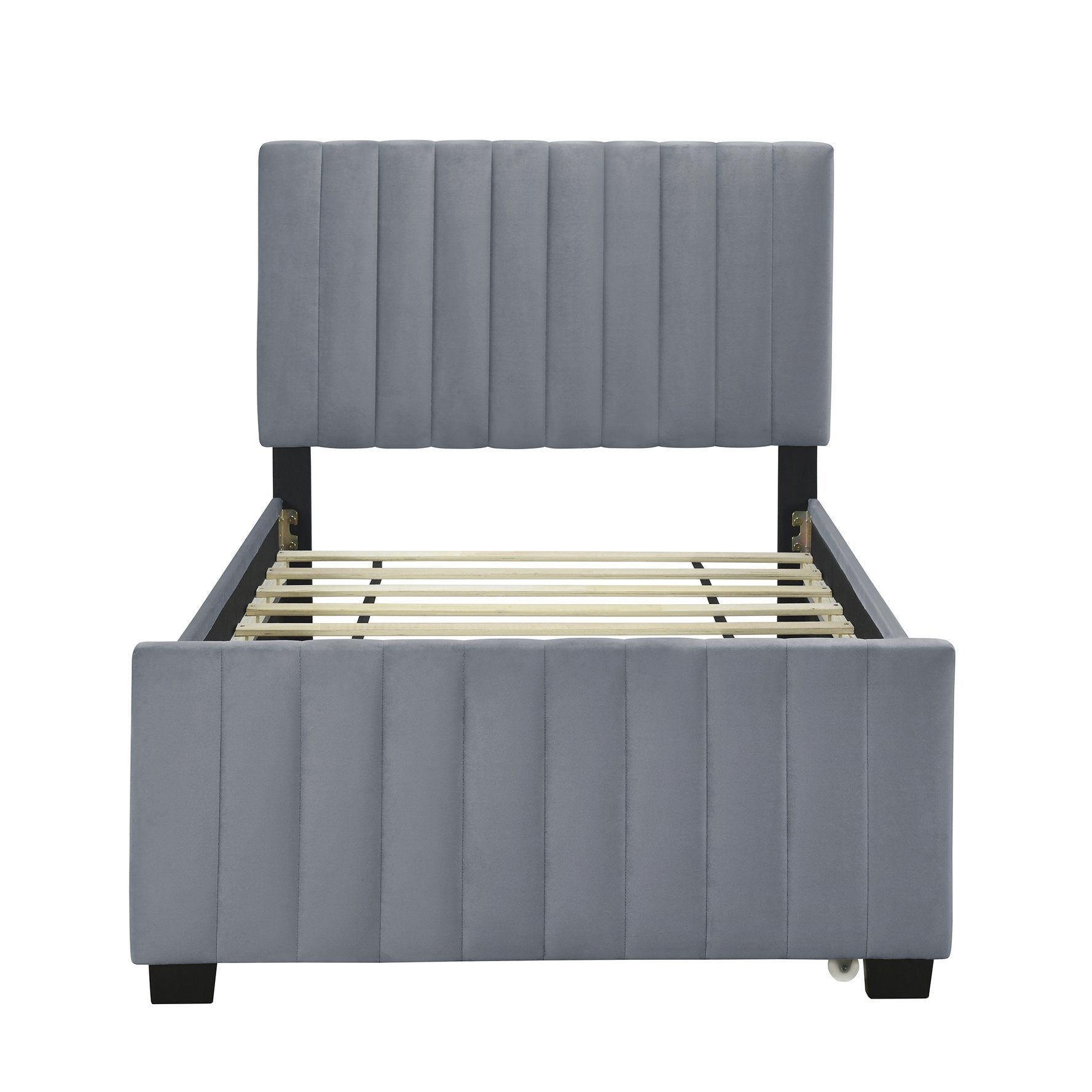 Give your guest room or child's bedroom a stylish, space-saving upgrade with this twin upholstered platform bed featuring a convenient twin trundle. Wrapped in soft velvet with clean lines and decorative detailing, it combines timeless design with practical functionality—ideal for sleepovers, small spaces, or a refined everyday sleep solution. Built on a sturdy plywood frame with 10+10 slats, the set supports comfortable mattresses without a box spring and keeps an elegant, coordinated look in beige, gray, or pink.