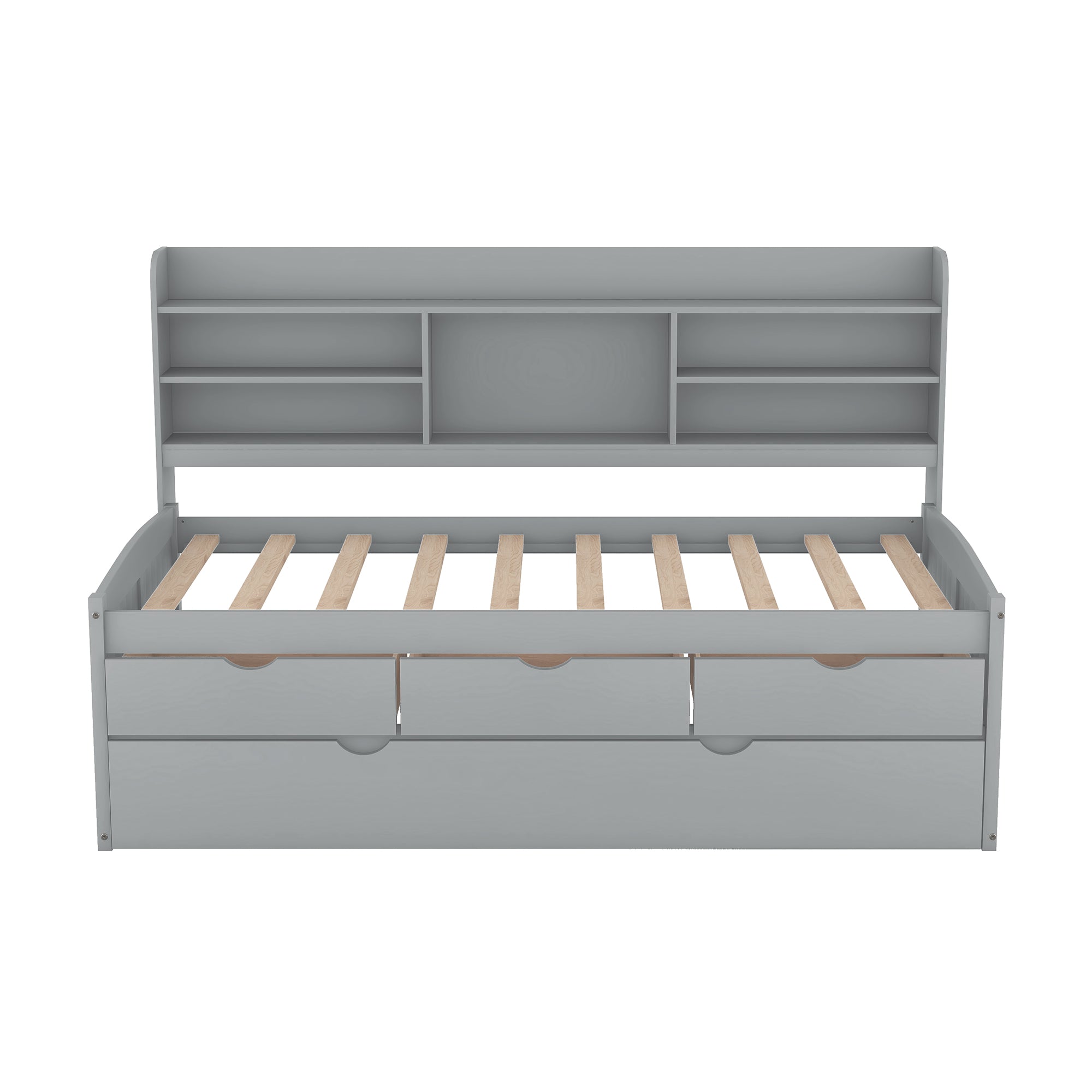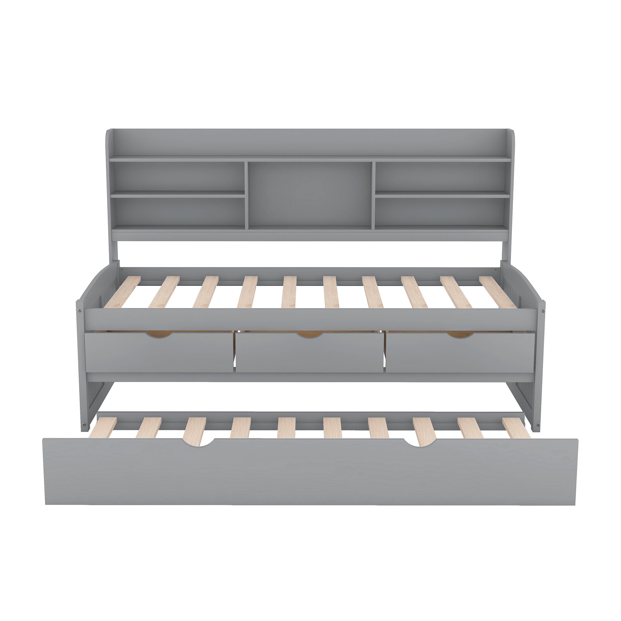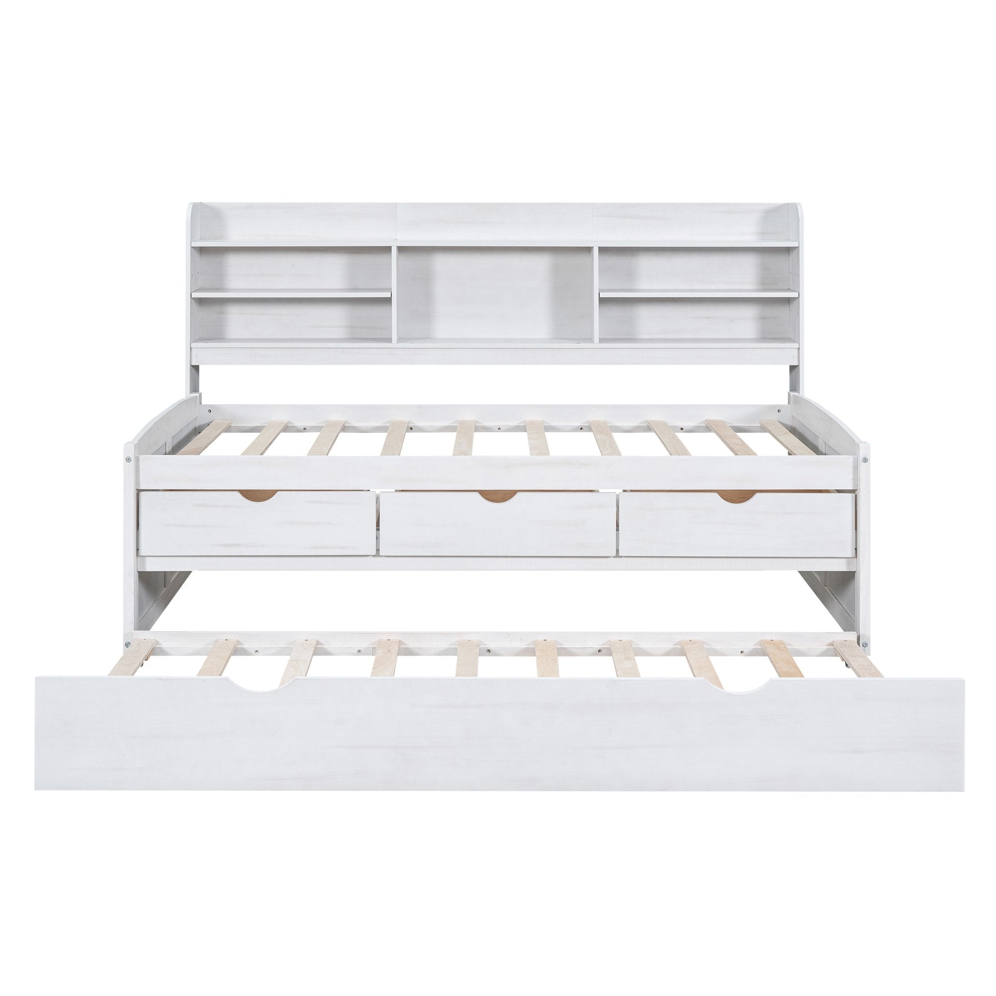 - Storage & Functionality: Bookcase headboard with shelving for books and display items; three large built-in under-bed drawers for clothes, toys or linens; pull-out trundle accommodates an extra mattress for guests.