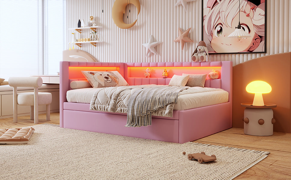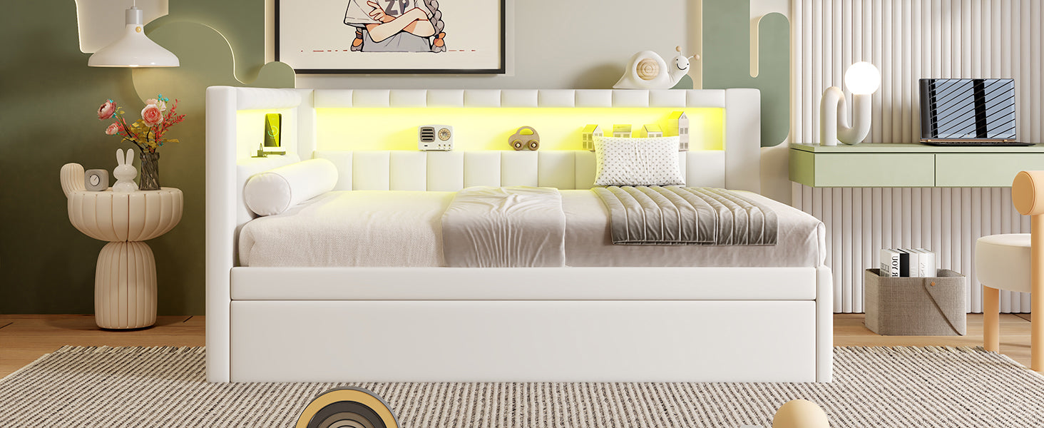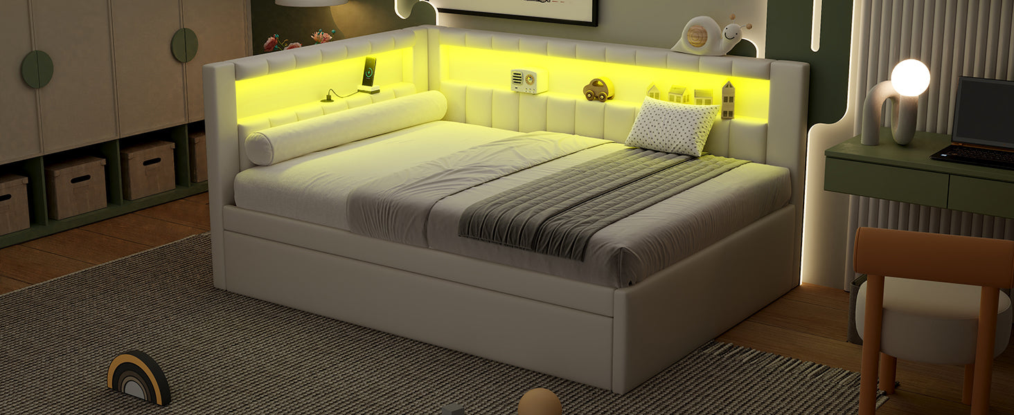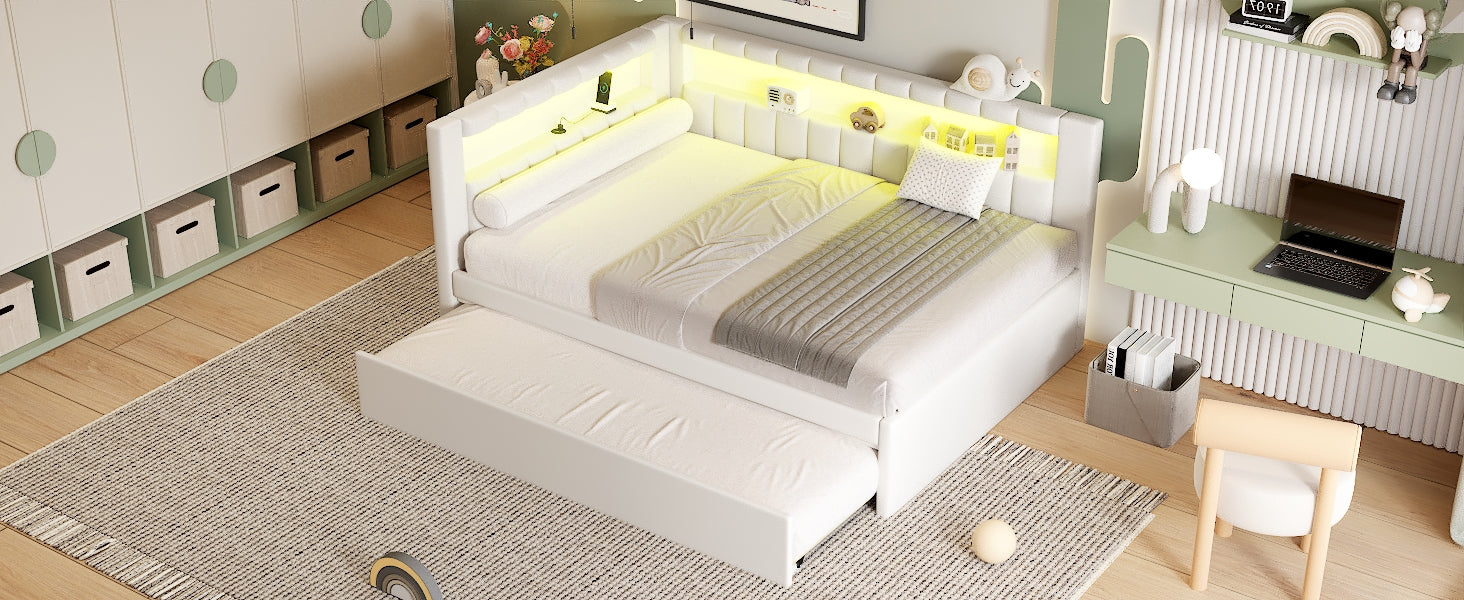 Upgrade your guest room or master bedroom with this elegant upholstered full-size platform bed featuring built-in USB ports, an LED belt for subtle ambient lighting, and a convenient pull-out trundle—perfect for sleepovers or extra guests. The clean silhouette and linen-covered headboard add refined texture to any décor, while a sturdy MDF frame and well-spaced slats provide reliable mattress support without the need for a box spring.