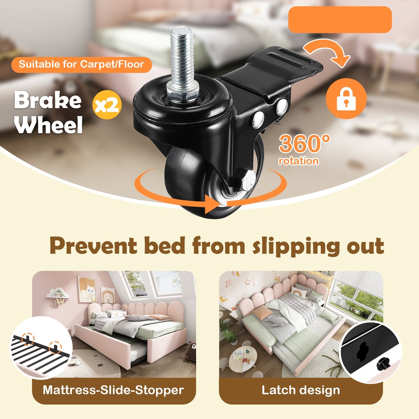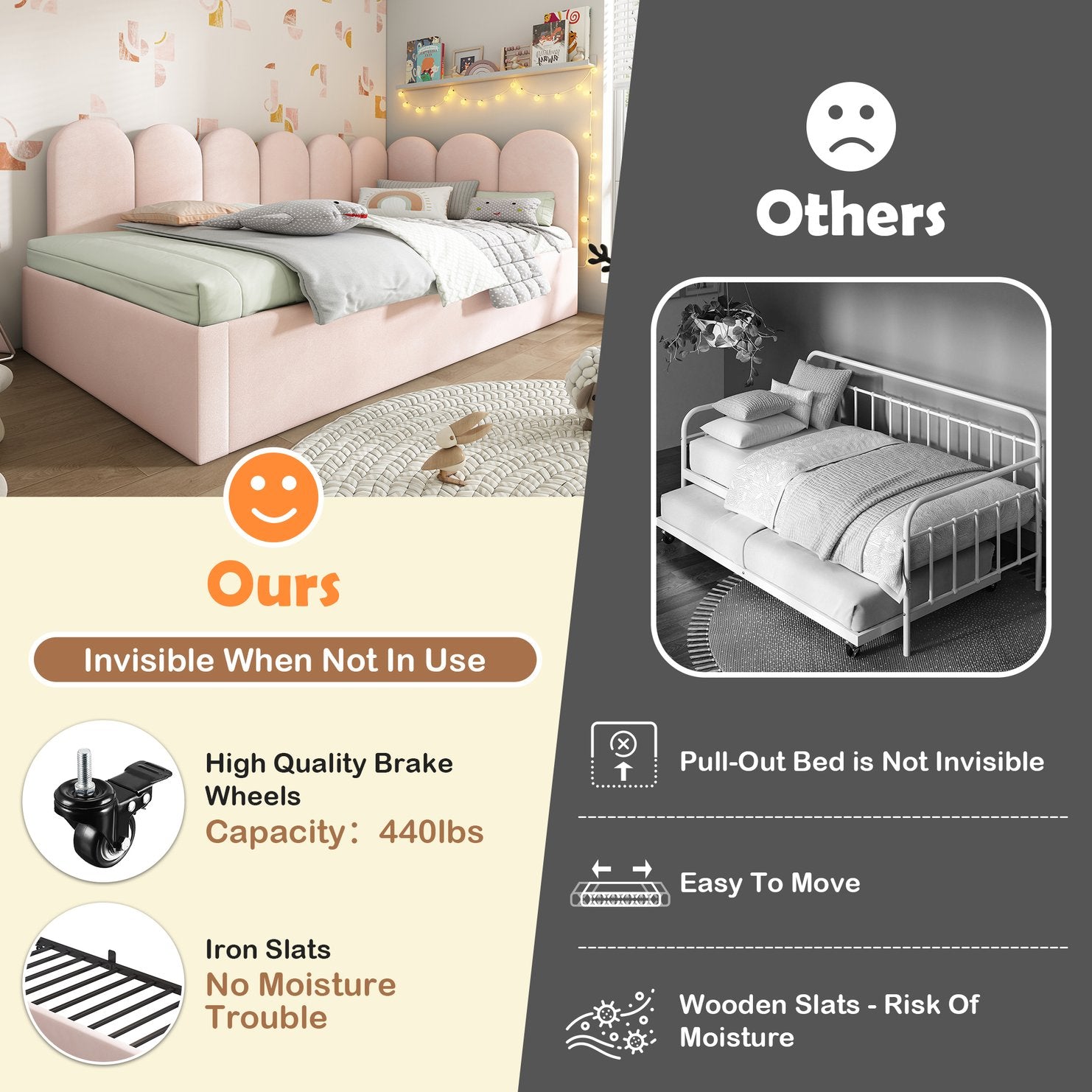 Bring stylish versatility to any bedroom or guest space with this elegant velvet-upholstered daybed and pull-out trundle. Designed for comfort and convenience, it functions as a chic seating sofa by day and two twin sleeping surfaces by night—ideal for kids, teens, or adult guests. The sturdy metal slatted frames provide reliable support without the need for a box spring, while the plush velvet finish in pink adds a soft, sophisticated touch to your décor.