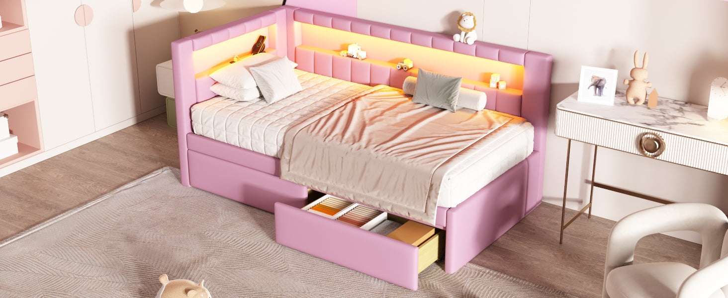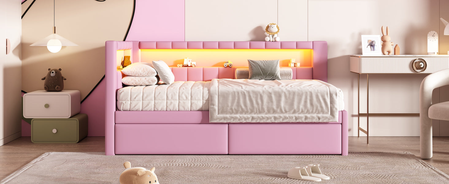Add a touch of modern elegance and smart convenience to a small bedroom with this upholstered twin platform bed. Padded linen upholstery and a streamlined silhouette create a cozy, contemporary focal point, while built-in USB ports, an LED belt, and two roomy drawers make it a space-saving, functional centerpiece perfect for dorms, guest rooms, or kid’s bedrooms.