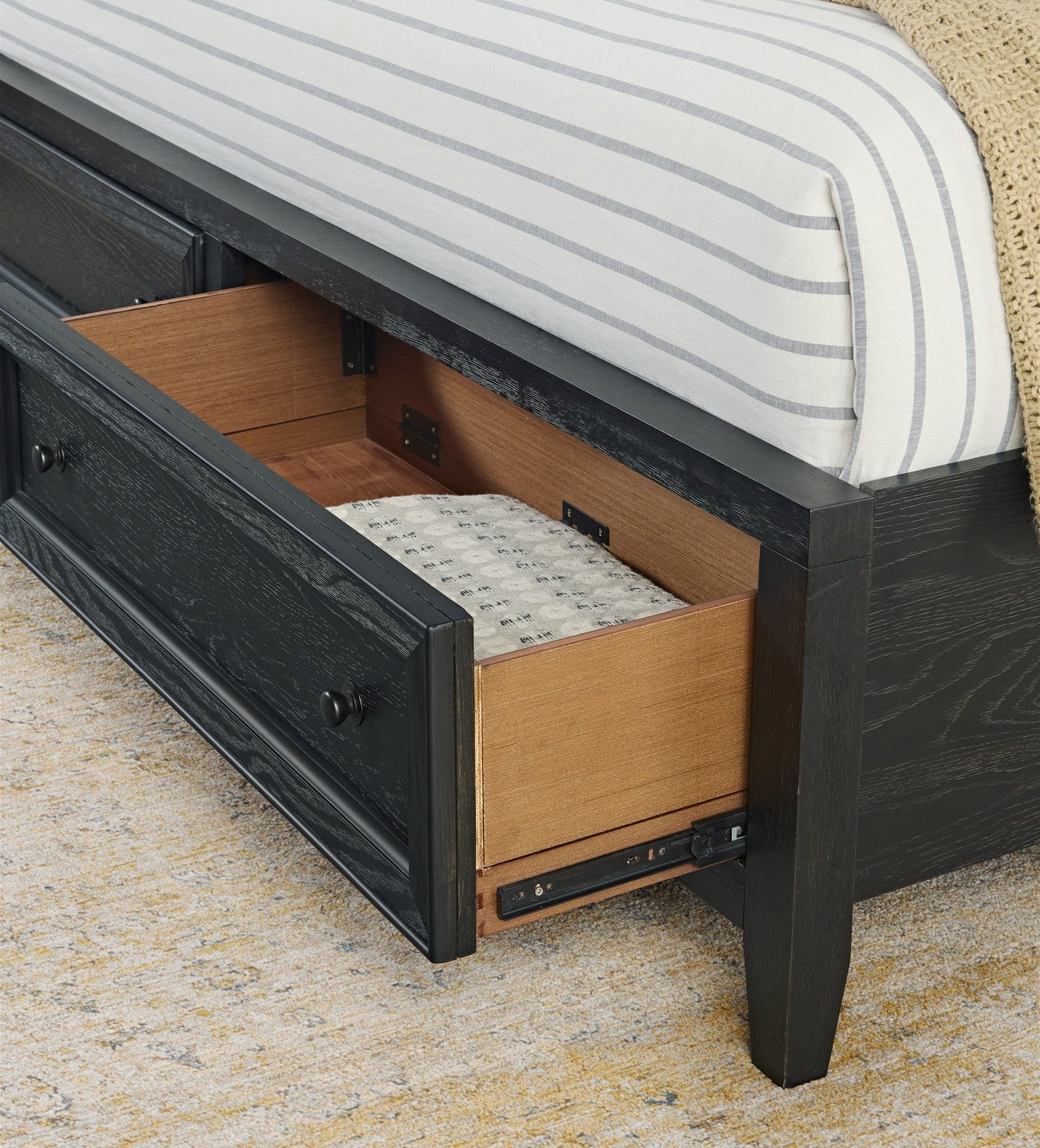 - Two spacious footboard drawers provide convenient storage for bedding, clothes, or accessories.