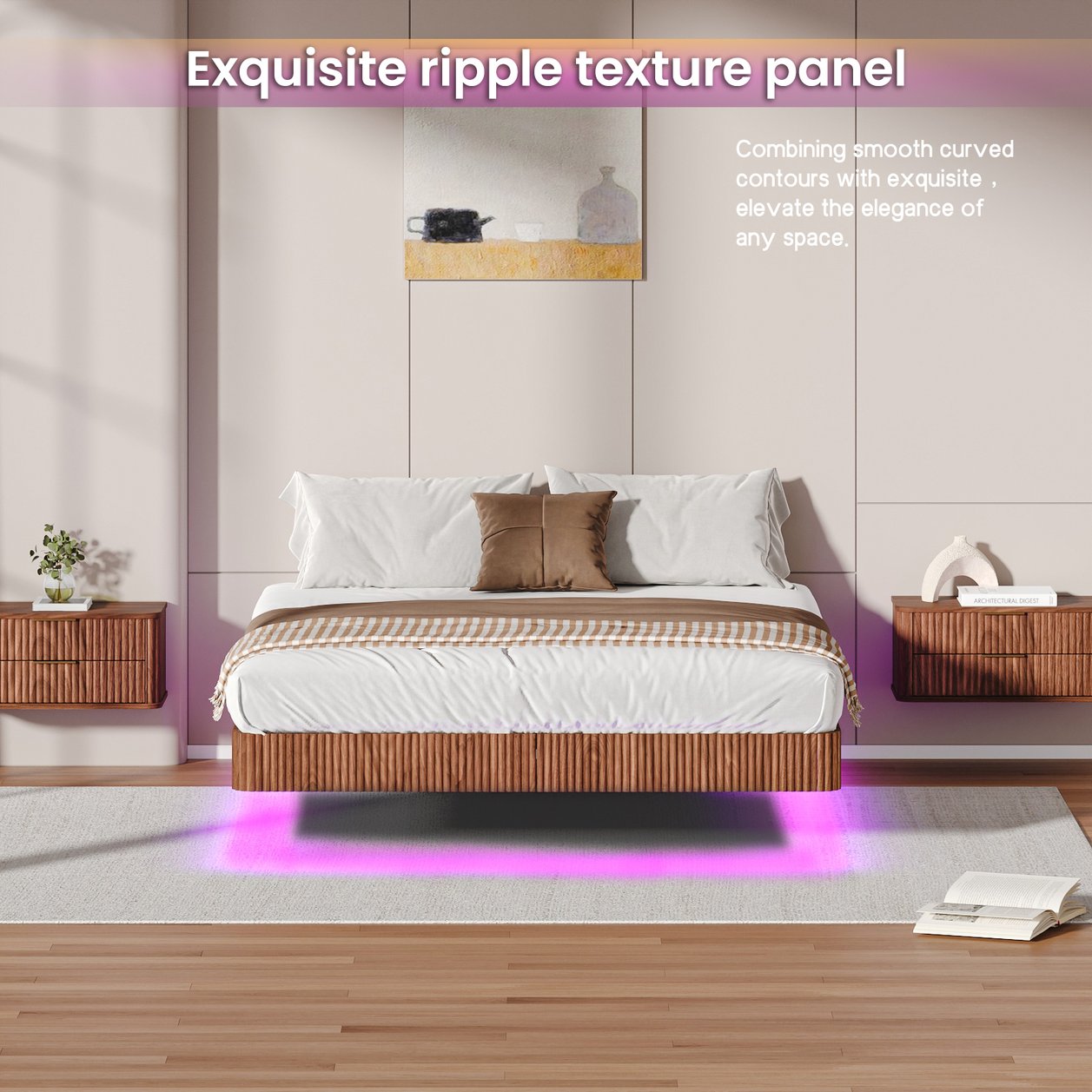 Elevate your bedroom with this modern Walnut Queen floating bed frame, designed for both style and sturdy support. The wave curve wood texture and integrated LED lights create a warm, contemporary focal point, while the heavy-duty metal slats eliminate the need for a box spring and provide reliable, long-lasting support.