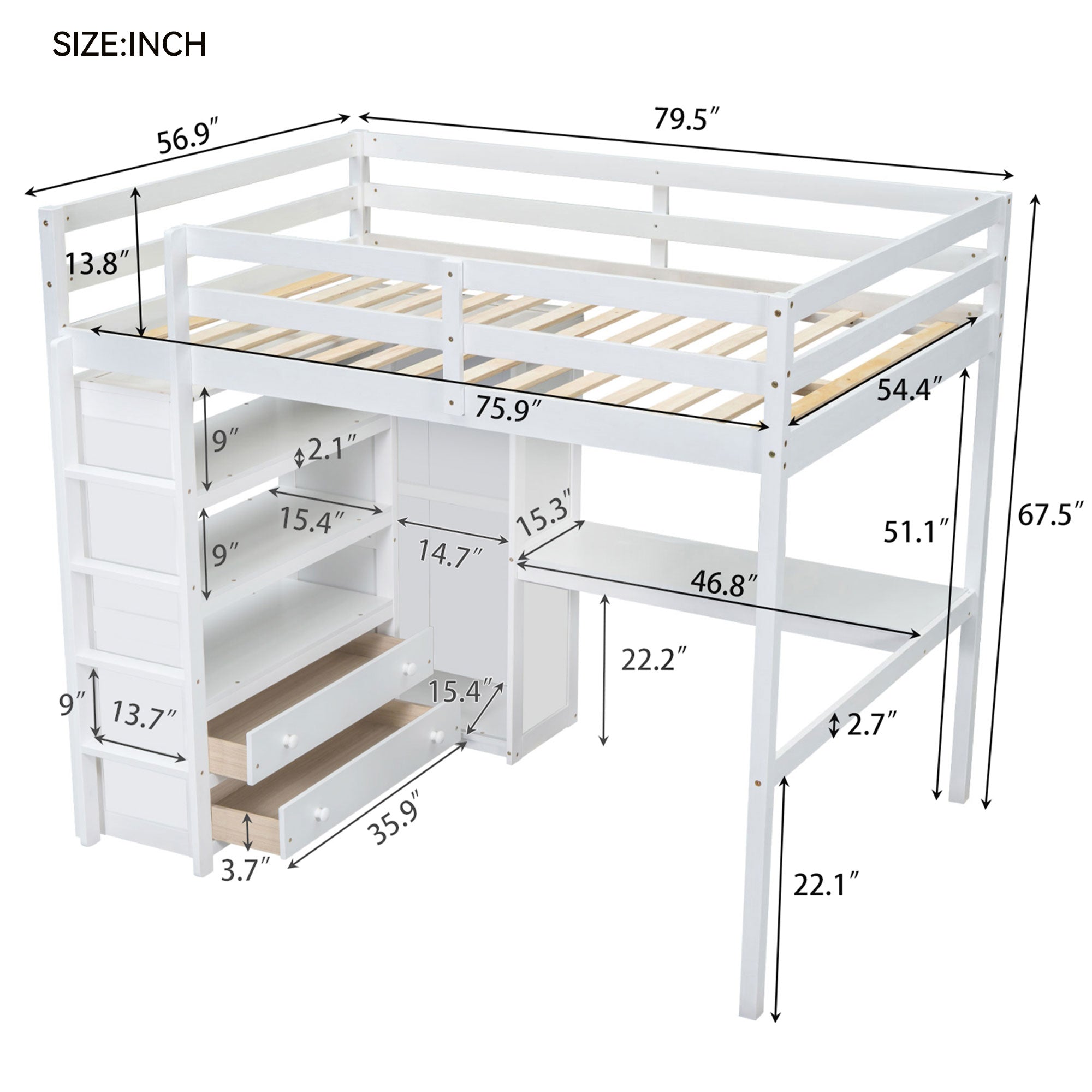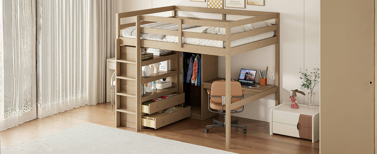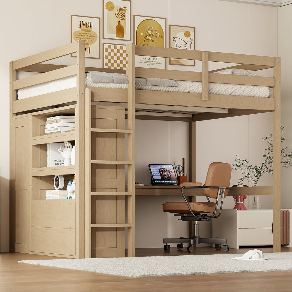 - Integrated workspace: Built-in desk located under the loft provides a dedicated study or work area to maximize floor space.