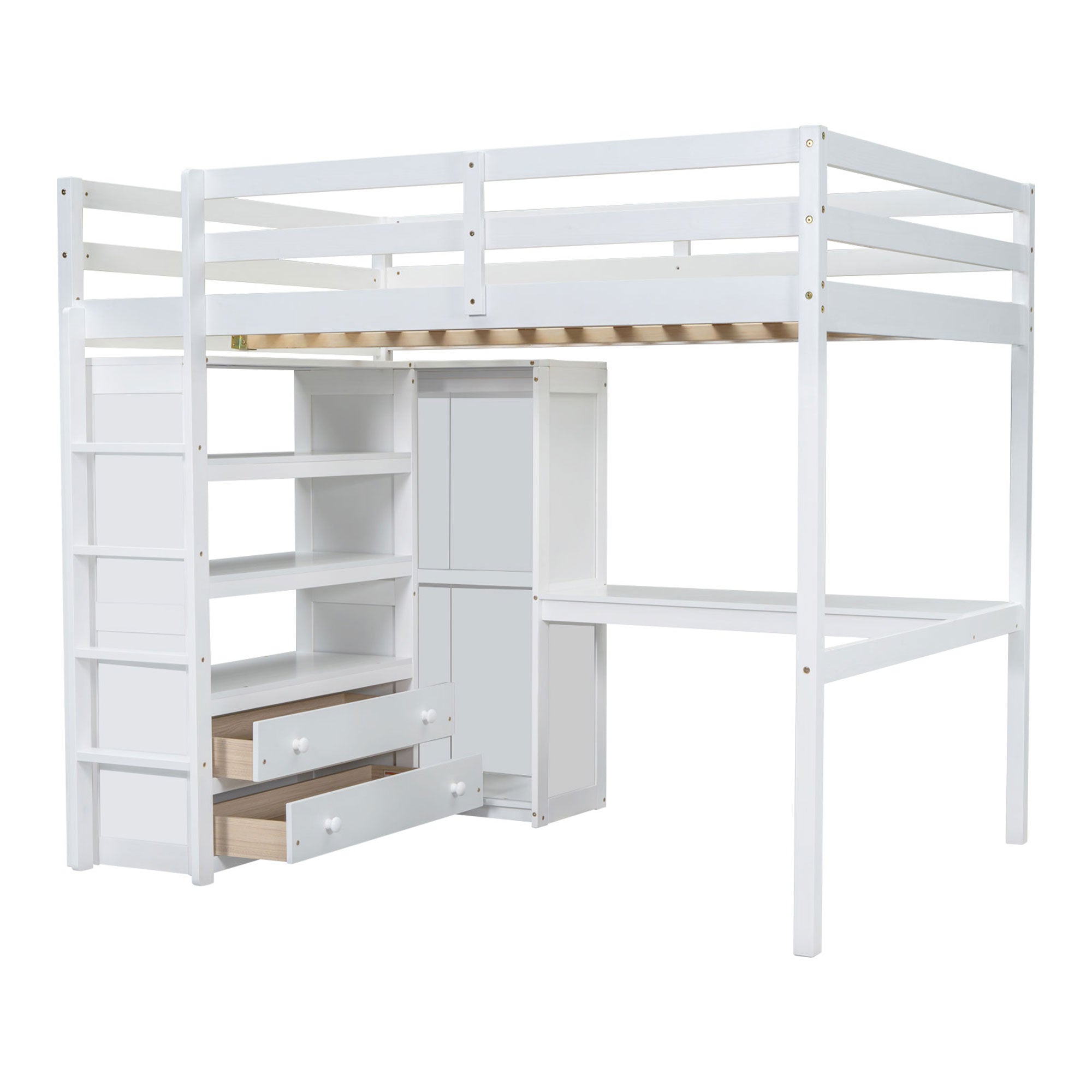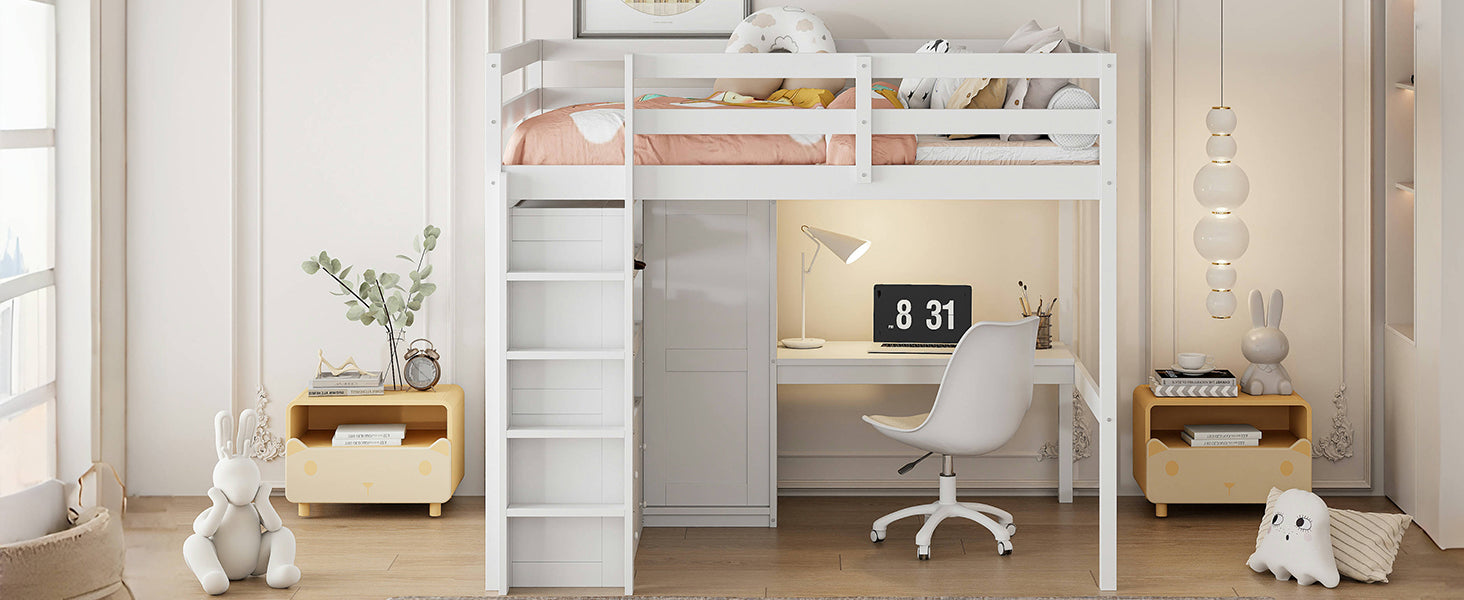 Give your bedroom an instant space-saving upgrade with this versatile full-size loft bed. Designed for small rooms, dorms, or multifunctional spaces, it combines a sturdy sleeping area with an integrated workspace and generous storage so you can sleep, study, and organize in one compact footprint. Crafted from pine wood and MDF with a clean white finish, the loft bed balances durability and contemporary style.