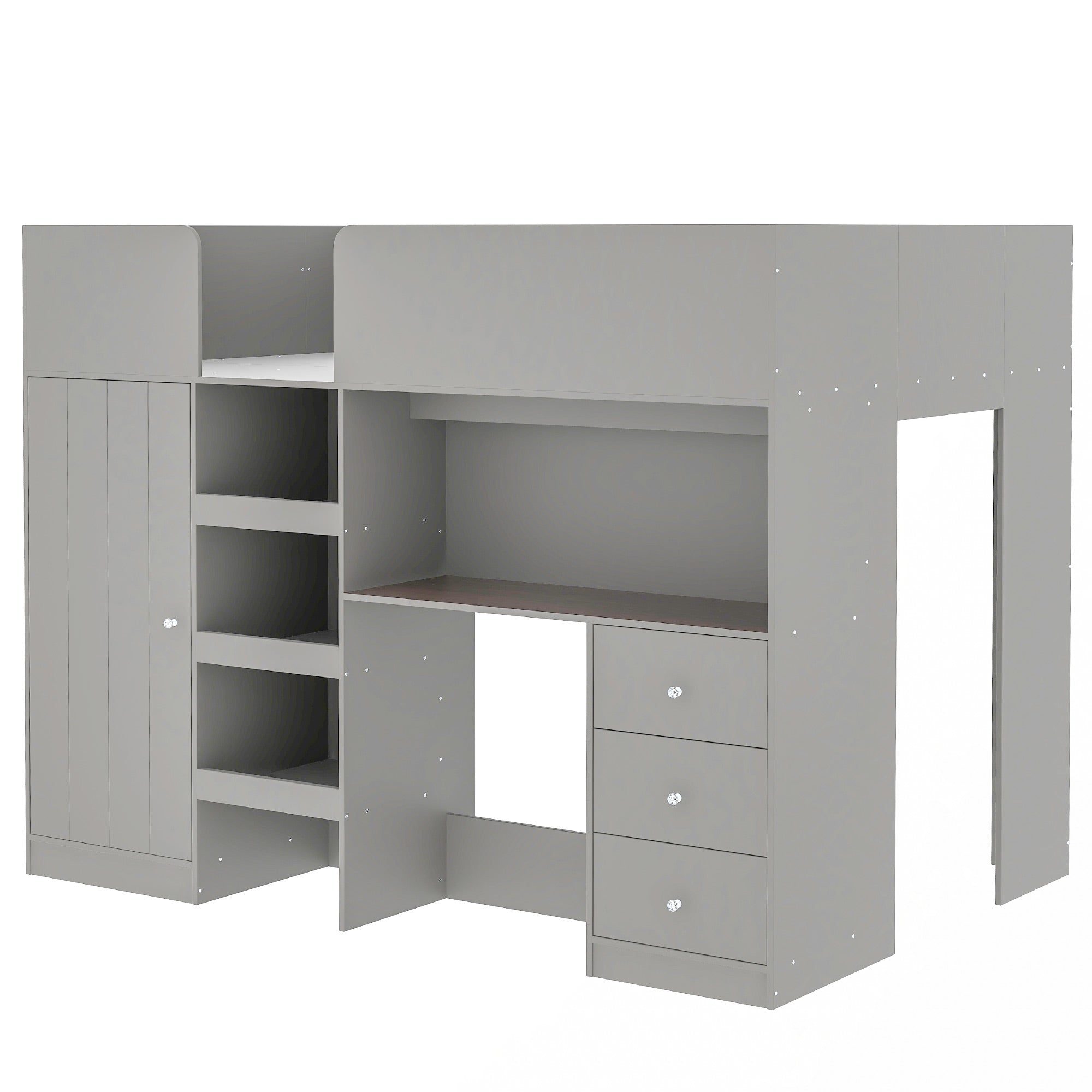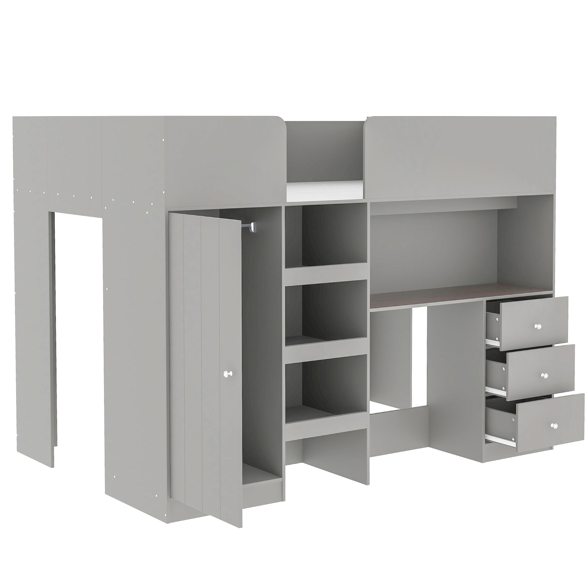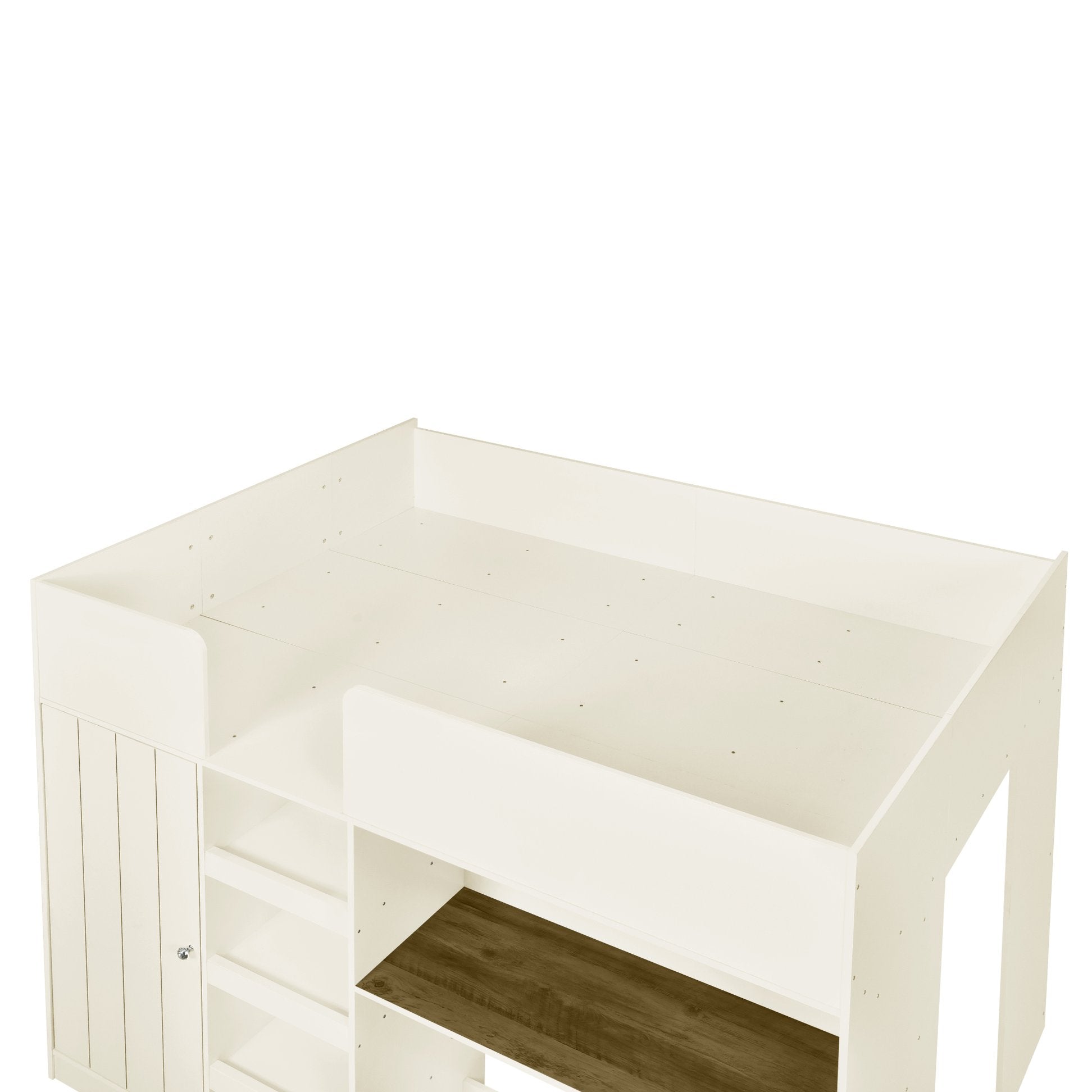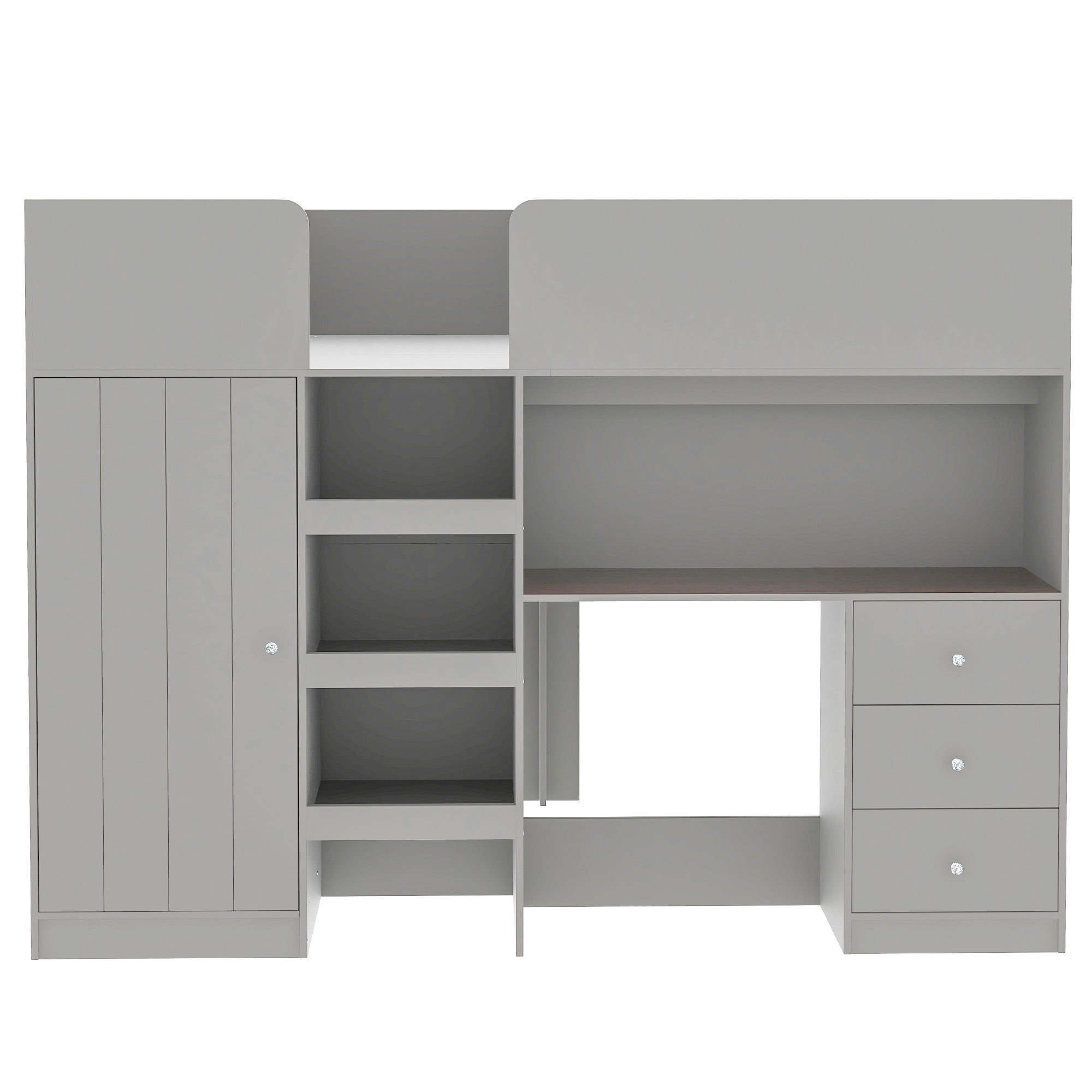 This versatile full-size loft bed combines sleeping, studying, and storage in one space-saving, stylish unit. Crafted from pine wood and MDF with a neutral beige finish, it’s designed for stability and everyday use while maximizing bedroom floor space with a built-in wardrobe, a roomy desk, open shelving, and three drawers for organized living.