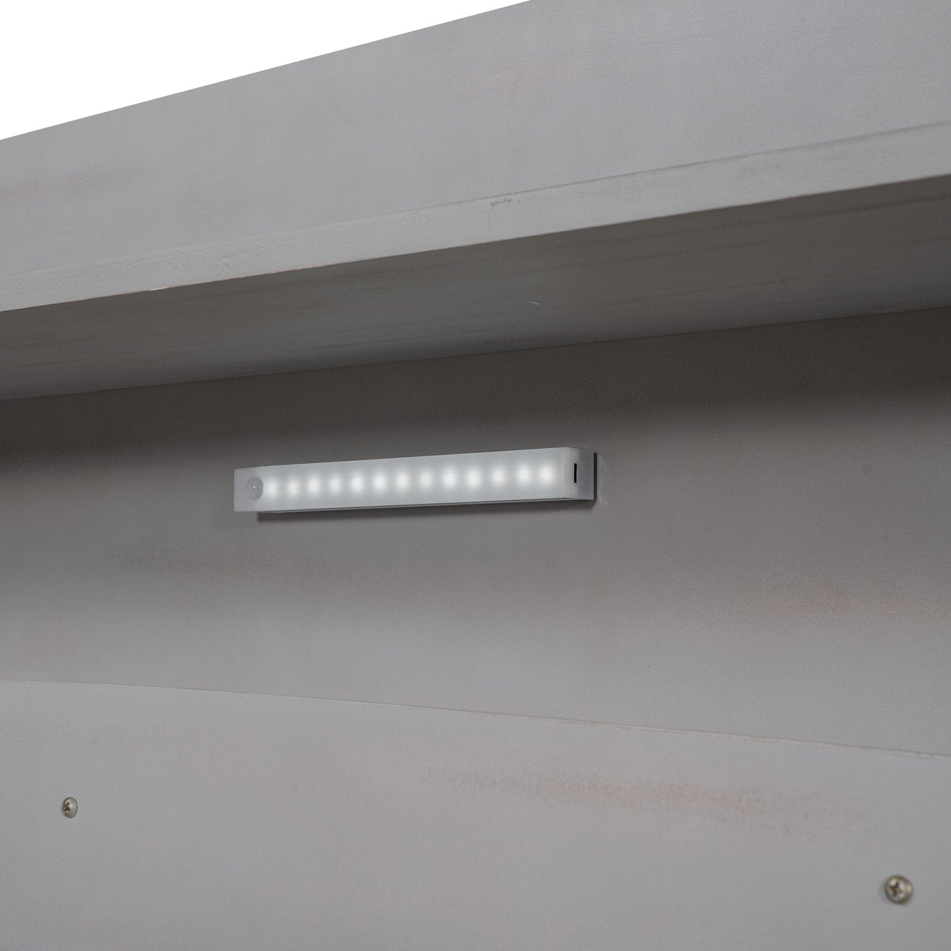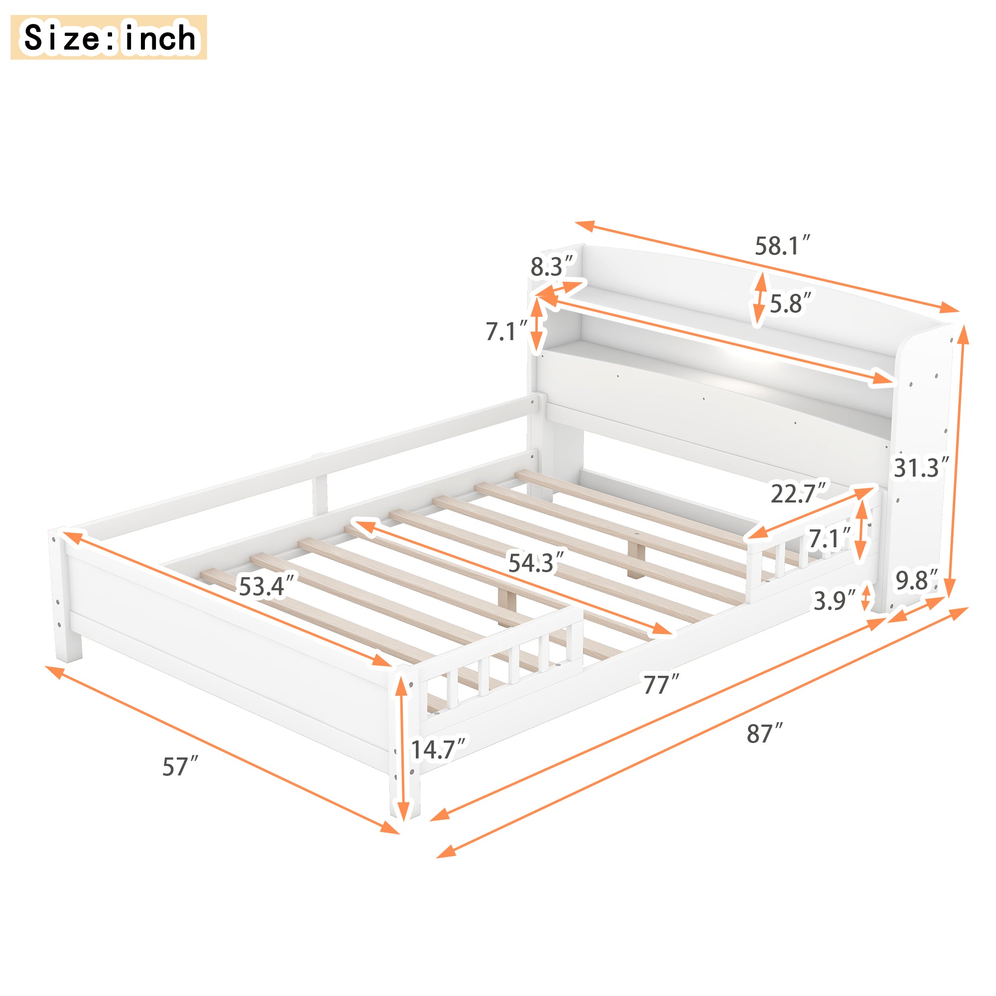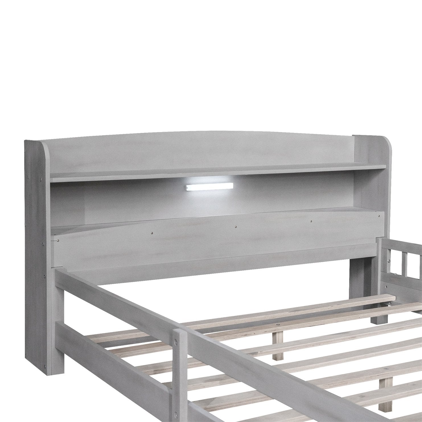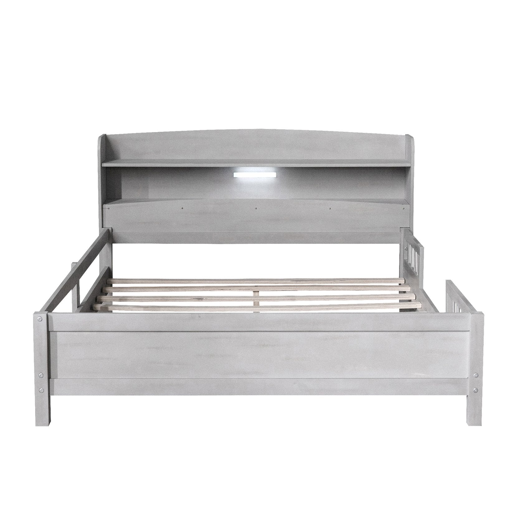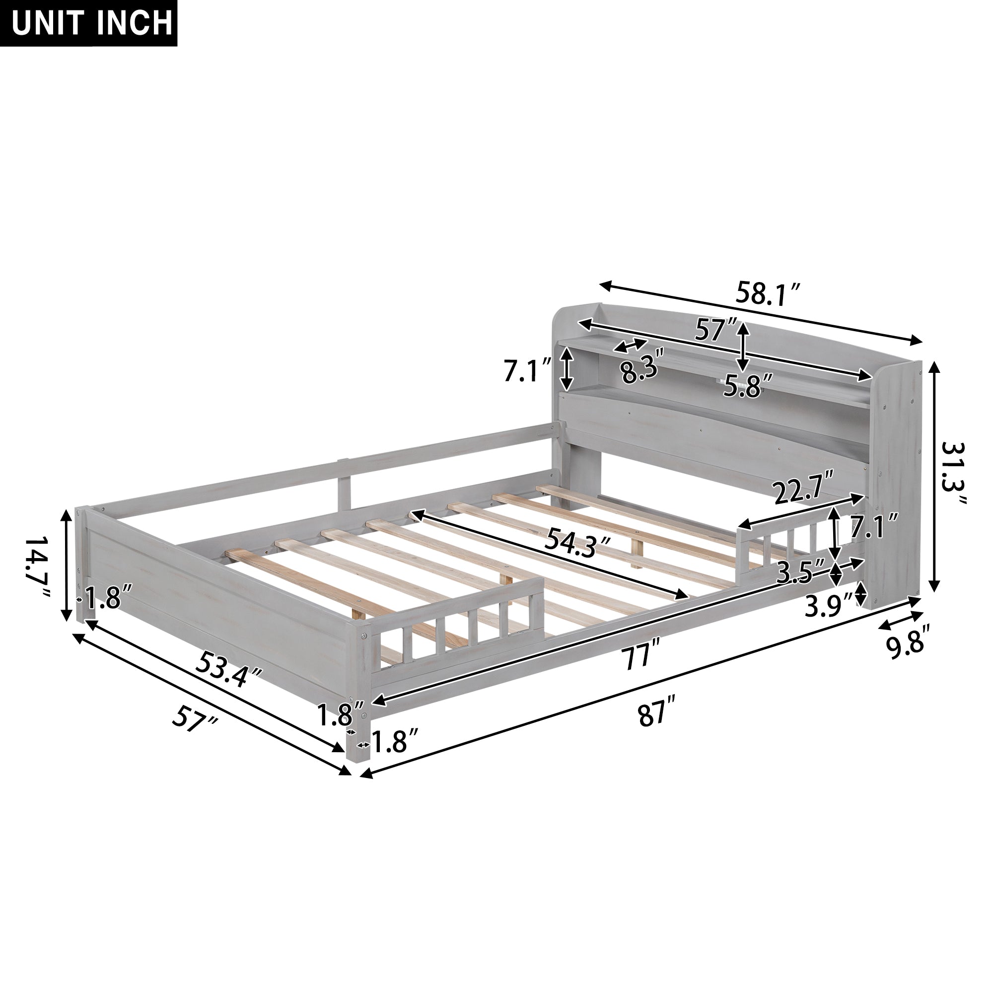 Bring modern function and subtle vintage charm to your bedroom with this Antique Grey full-size platform bed. Built from durable pine and MDF with a distressed finish, it combines a space-saving storage headboard, integrated LED lighting for bedtime reading, and protective guardrails for secure, comfortable sleep—no box spring required. Easy to assemble and thoughtfully designed, it supports a standard full mattress while keeping cords and essentials tidy.