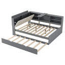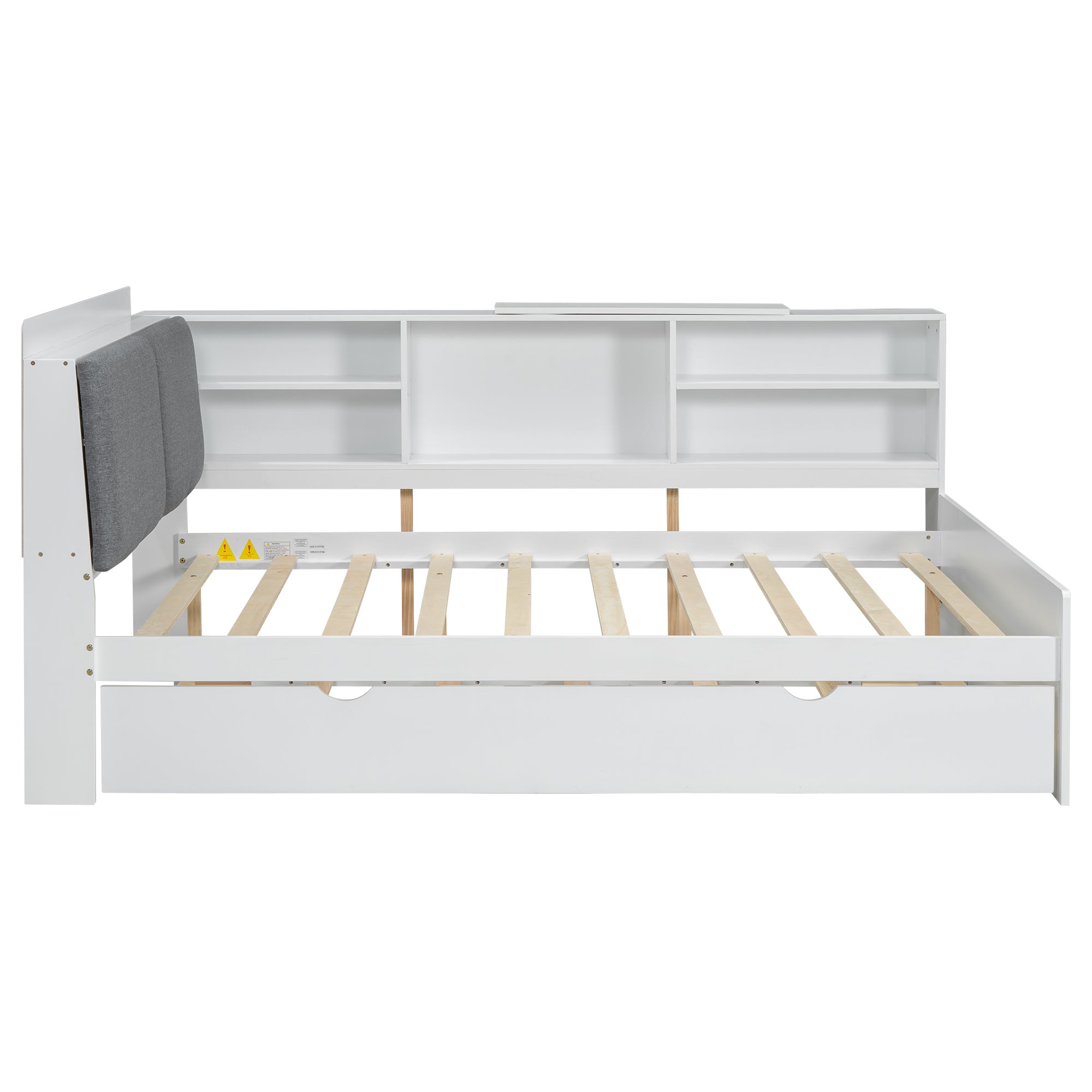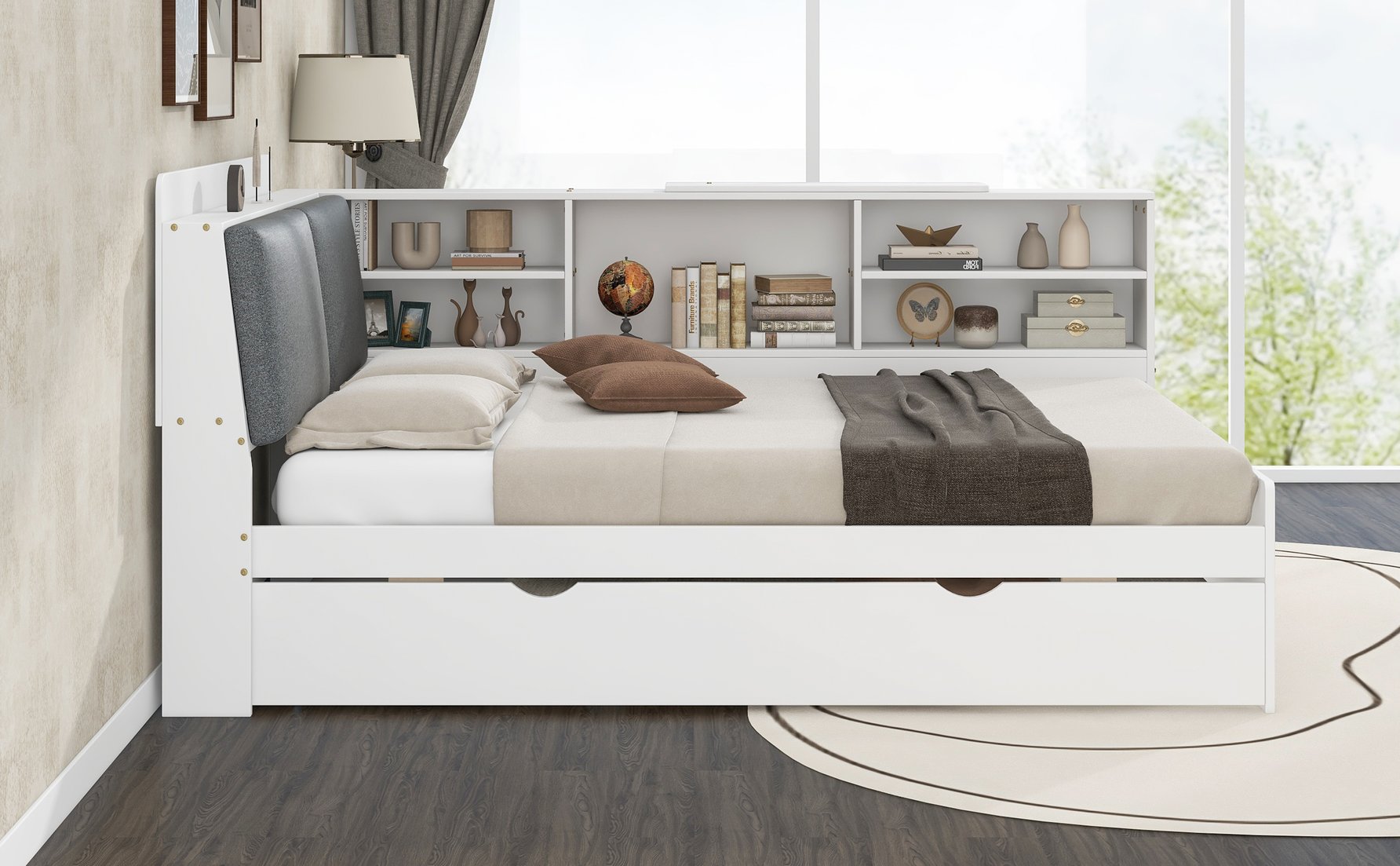 Simple, functional, and built to maximize space, this full-size wood platform bed with trundle and storage headboard blends classic styling with practical organization. Crafted from pine and MDF with a sturdy slatted platform, it provides reliable support without a box spring while offering convenient shelving and a pull-out trundle—ideal for guest rooms, kids’ rooms, or compact living spaces.