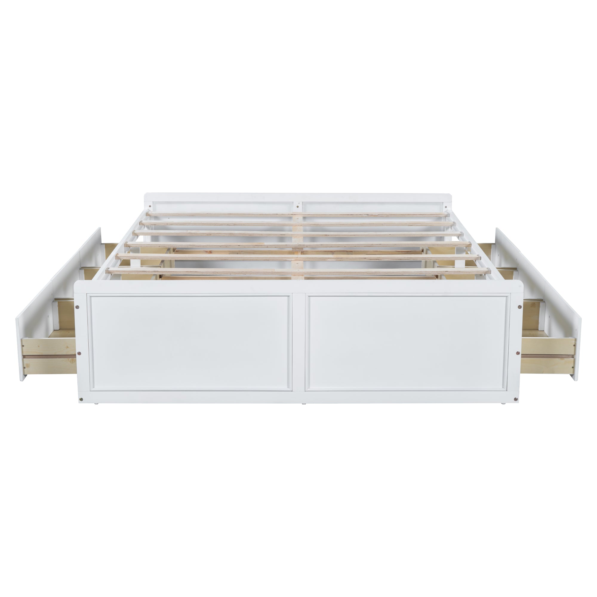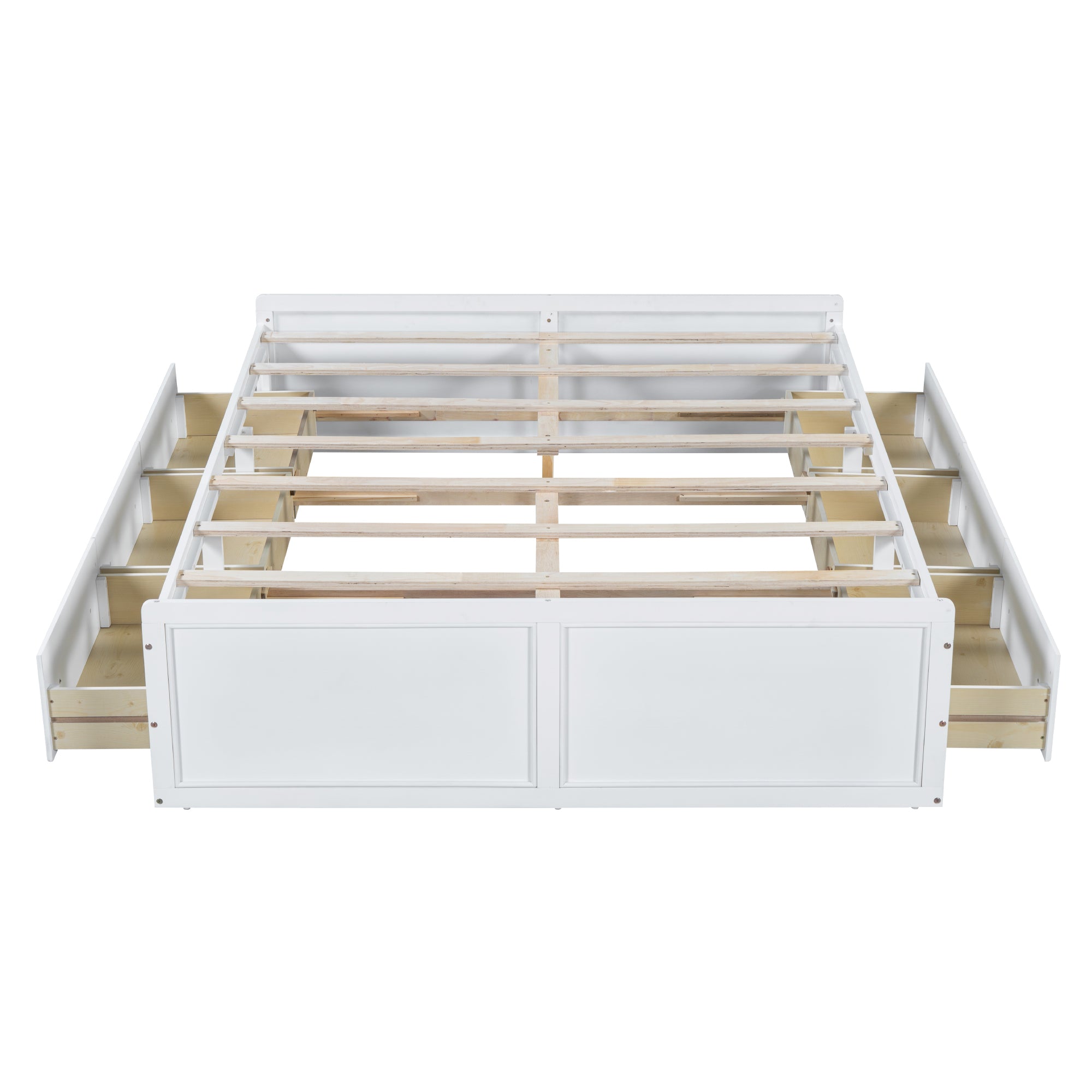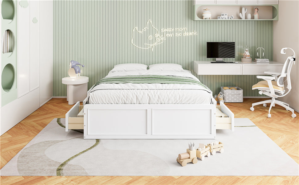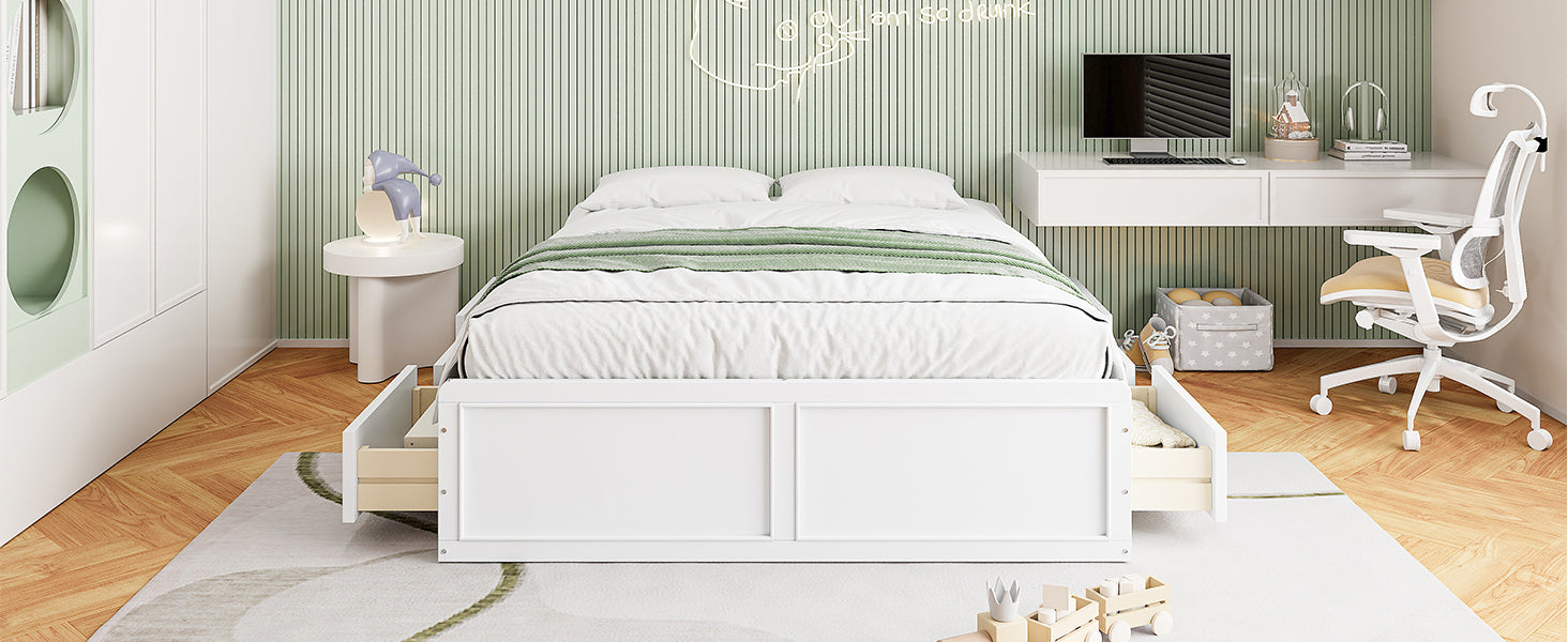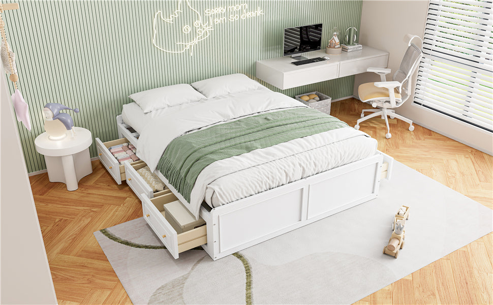 Simple, stylish, and built for everyday living — this white wood platform bed combines clean lines with smart storage to maximize space without sacrificing comfort. Crafted from pine wood and MDF, the queen-size frame offers a sturdy slatted support system and six built-in drawers, making it an ideal choice for smaller bedrooms, guest rooms, or anyone who prefers a streamlined, clutter-free look.