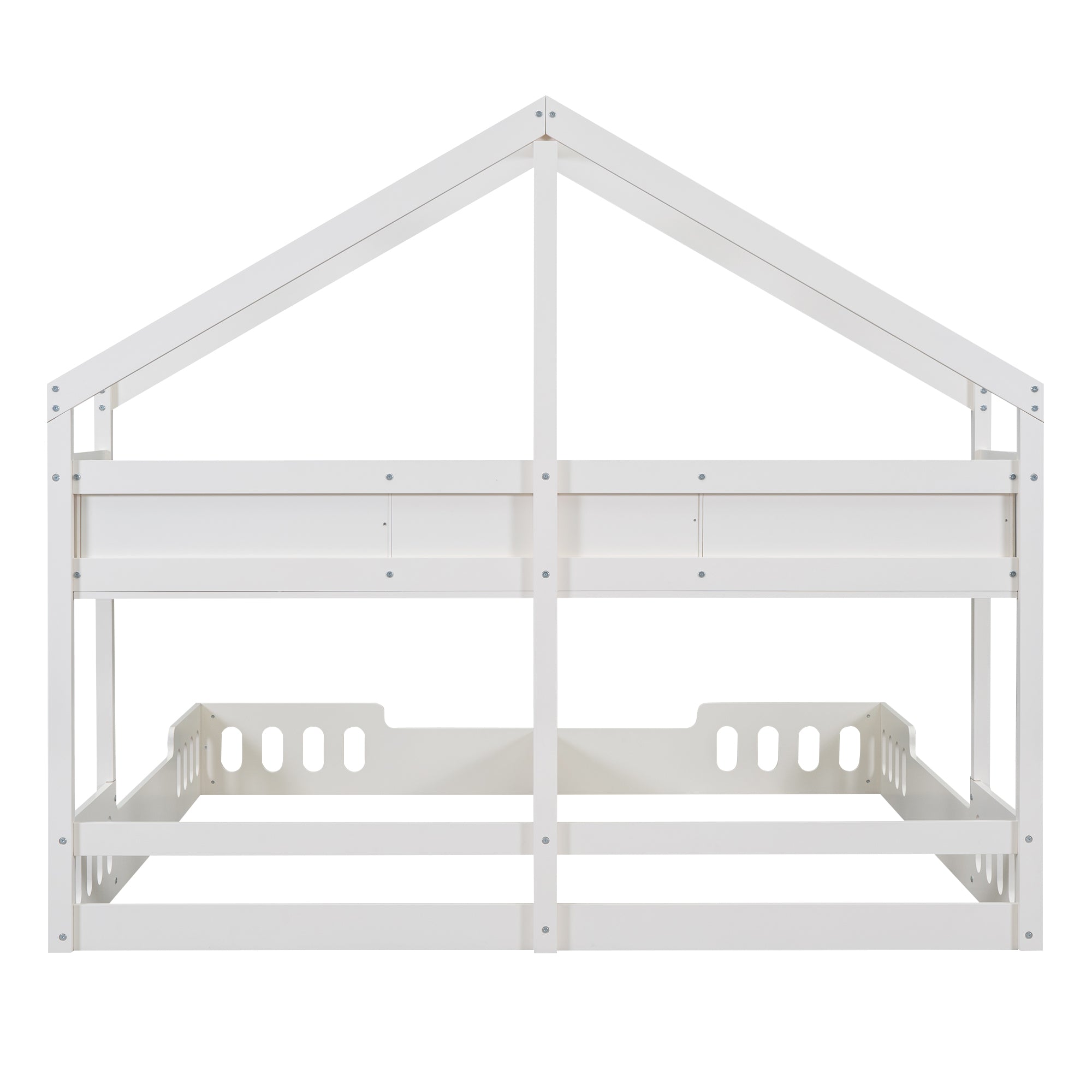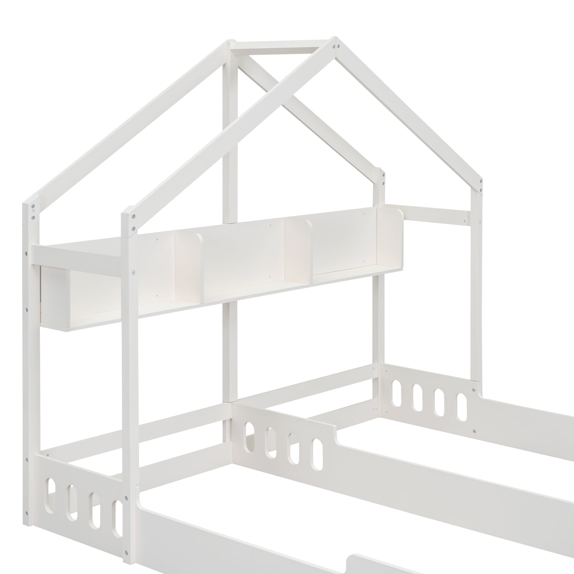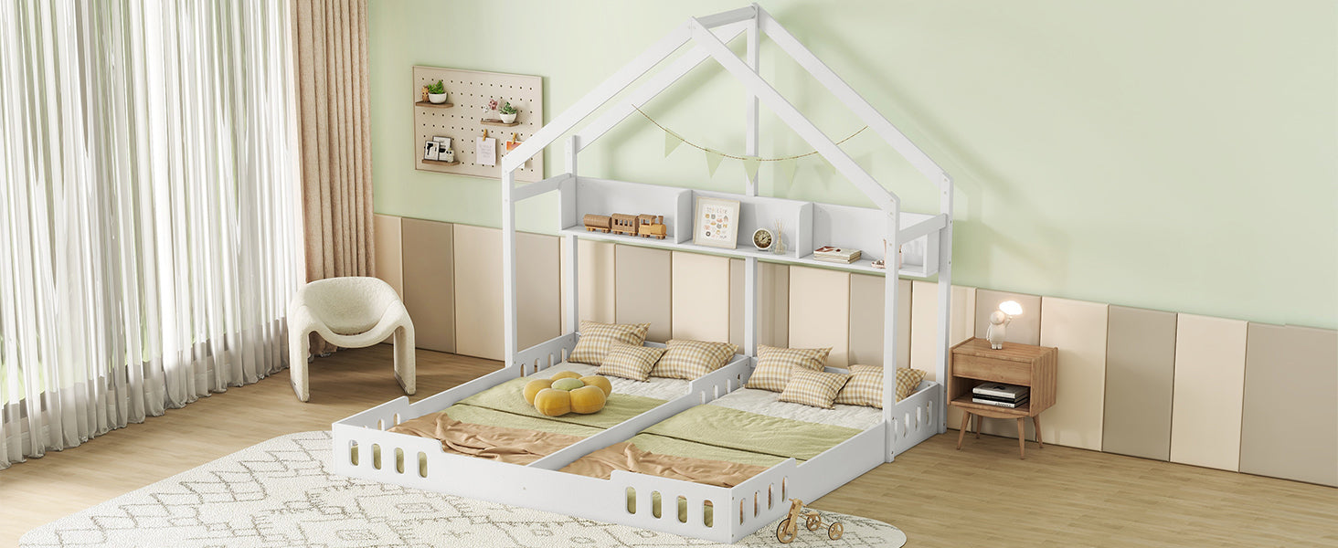 This stylish and practical creamy white twin house platform bed is designed for families who need two adjacent sleeping spaces in a single footprint. Built from pine wood and MDF, it combines a charming house-frame silhouette with built-in guardrails and shelving to maximize safety and storage without the need for a box spring. Ideal for siblings, guest rooms, or compact living spaces, it supports a simple mattress profile (recommended up to 6") and assembles at home.