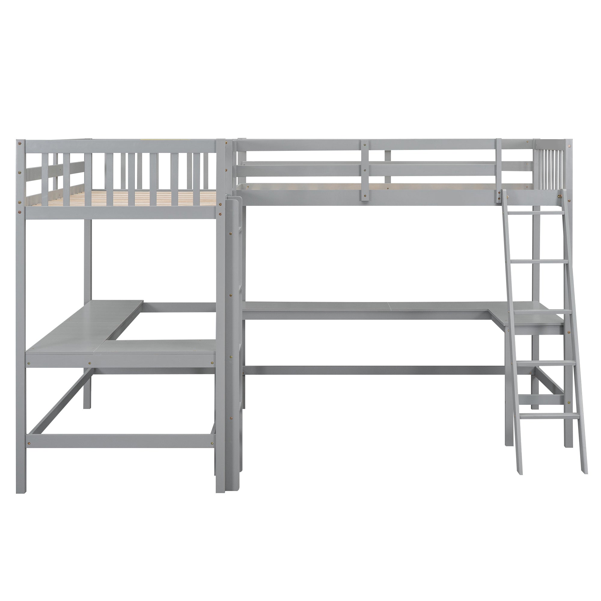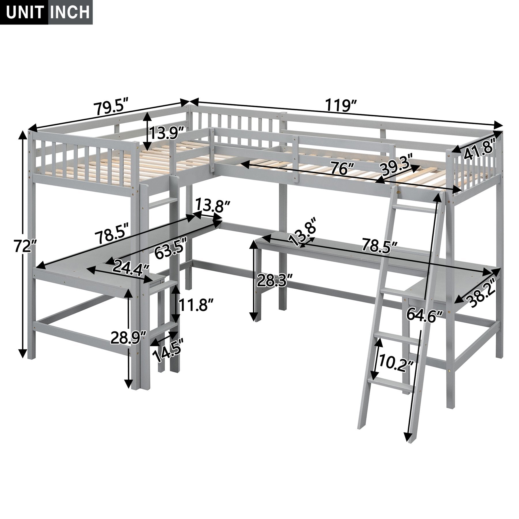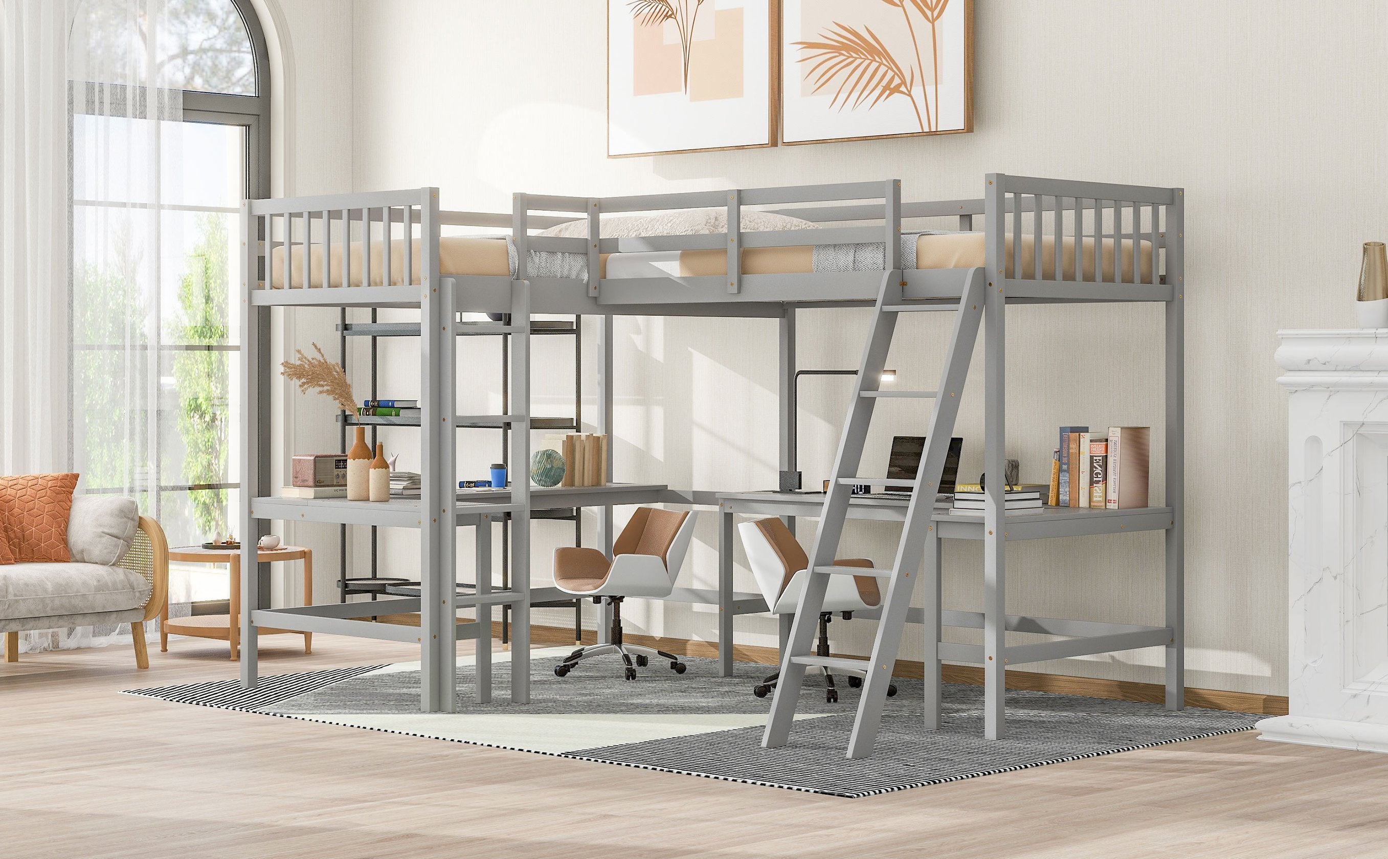- Configuration: Twin-size L-shaped loft bed with two built-in L-shaped desks positioned beneath the loft to form an efficient study or gaming area.