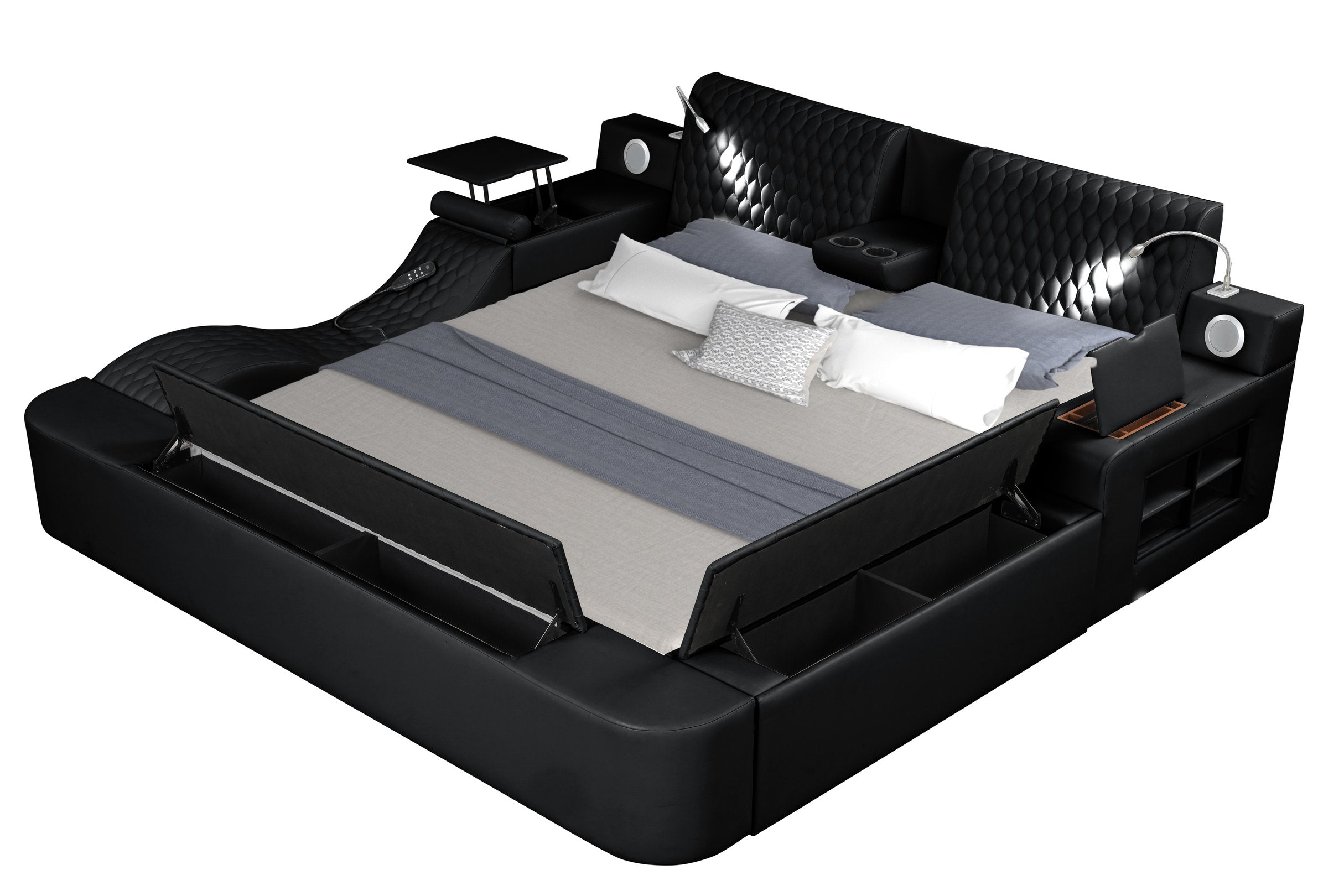 Transform your bedroom into a modern retreat with this smart, all-in-one queen bed that blends style, comfort, and technology. Designed for convenience and relaxation, it combines a cushioned headboard, integrated storage, a remote-controlled massager, built-in speakers, USB charging, and reading lights—making it an ideal centerpiece for a contemporary master or guest room.