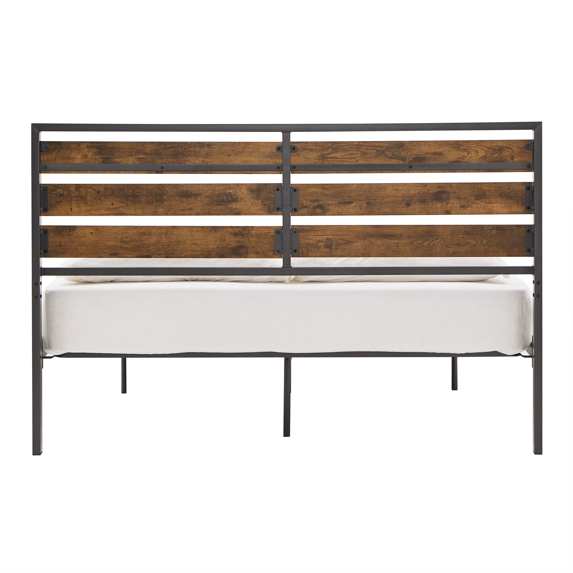 - Sturdy metal slatted and wood finish panels