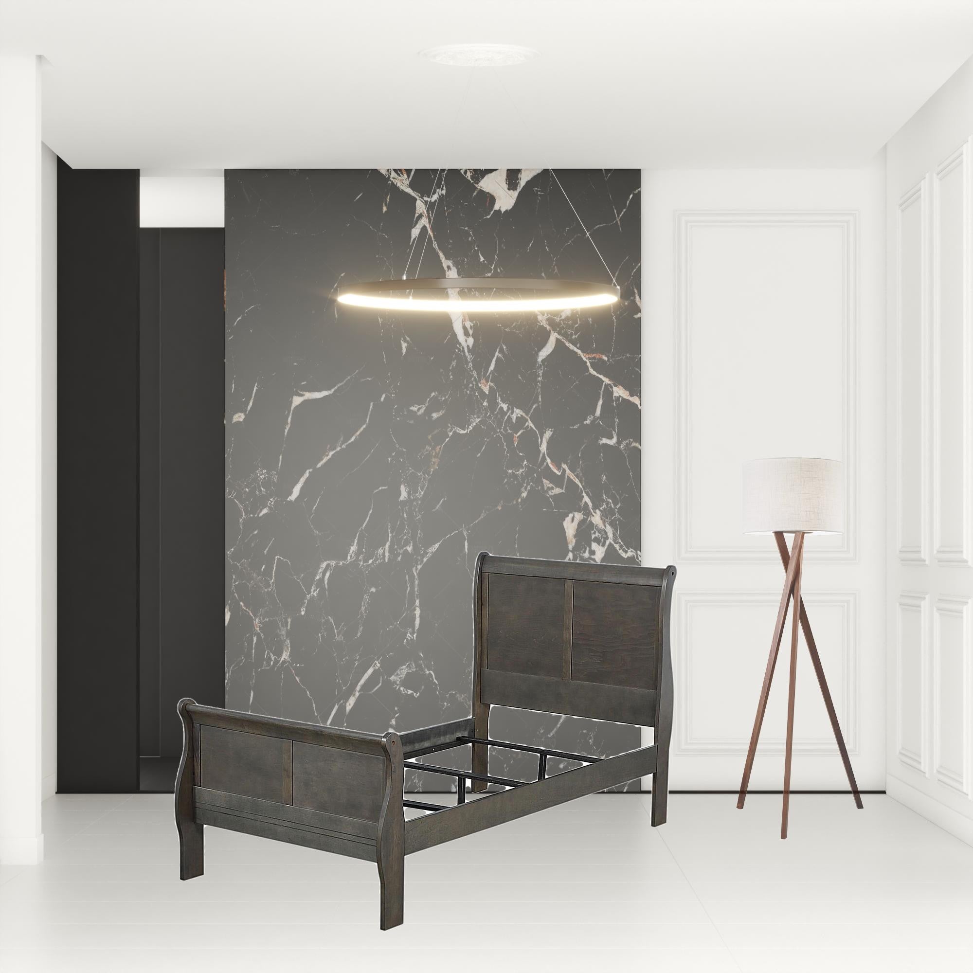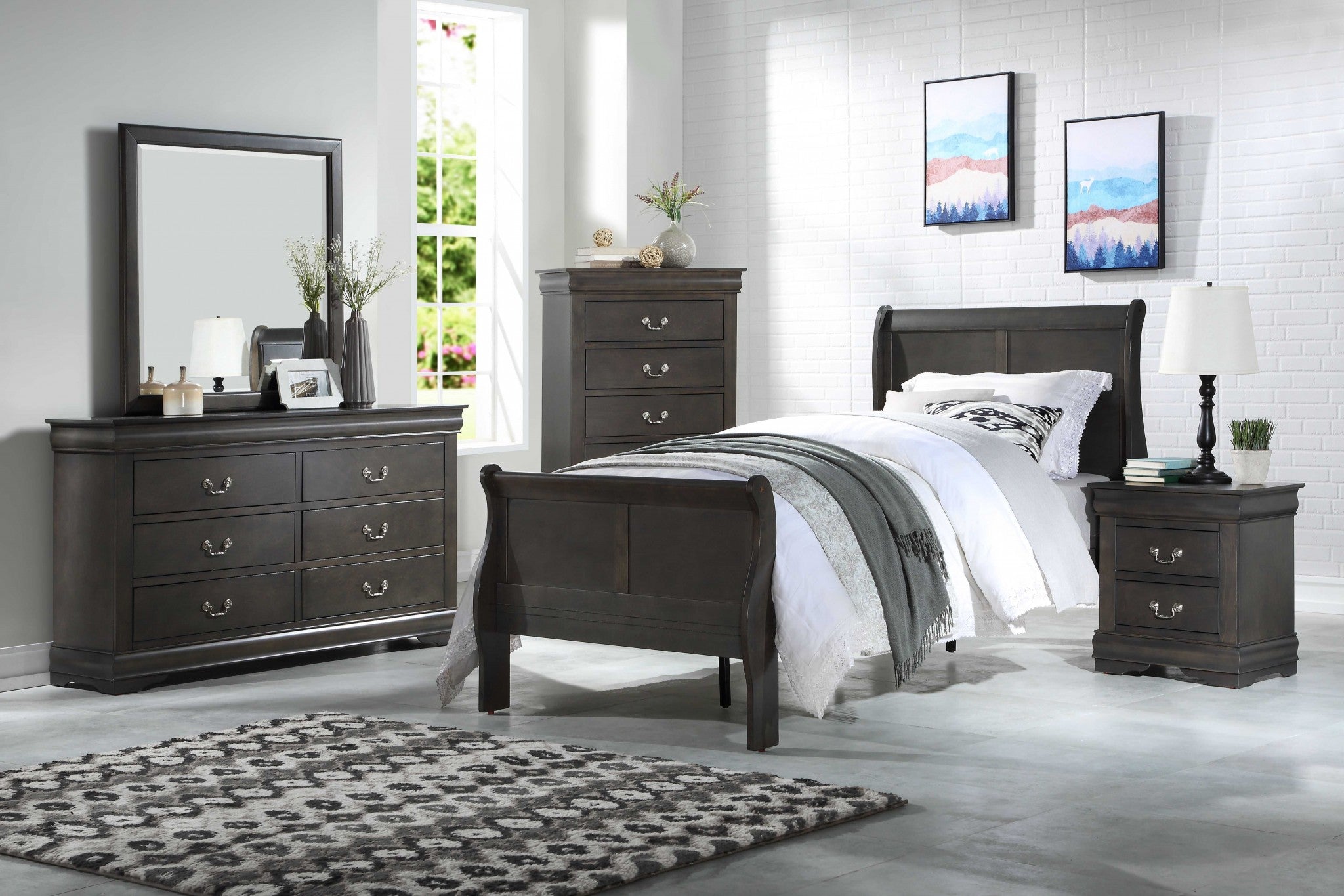 - Classic and elegant dark gray sleigh bed with a panel headboard.