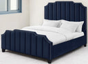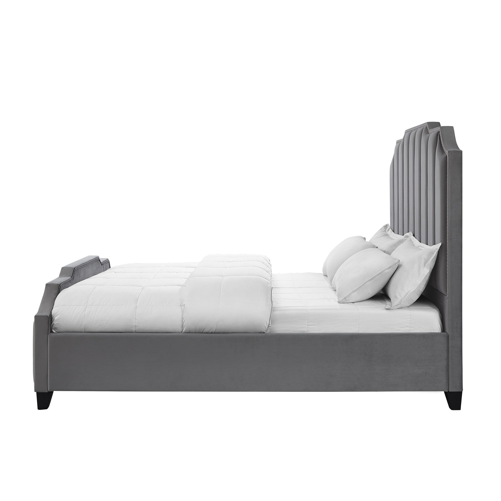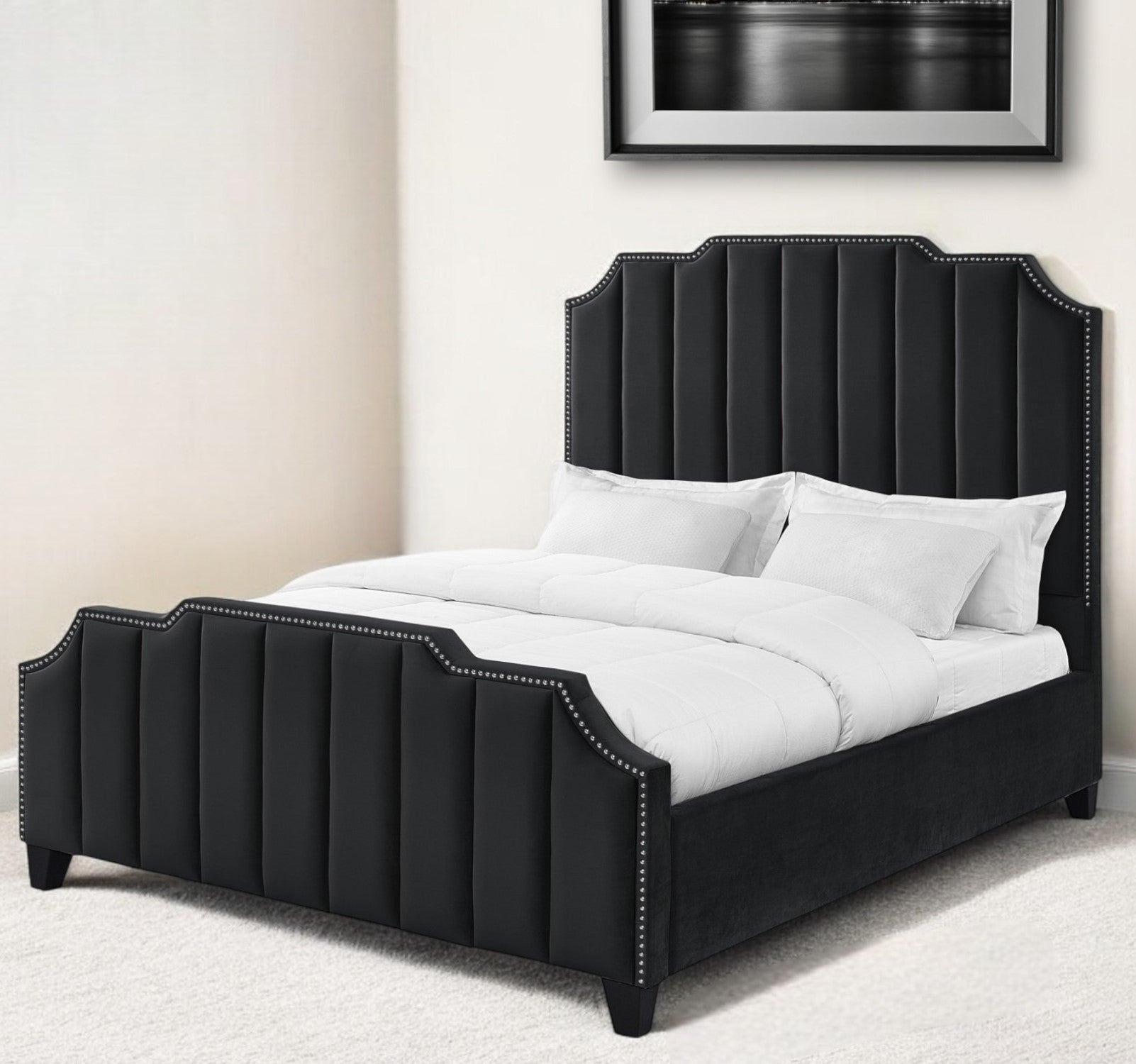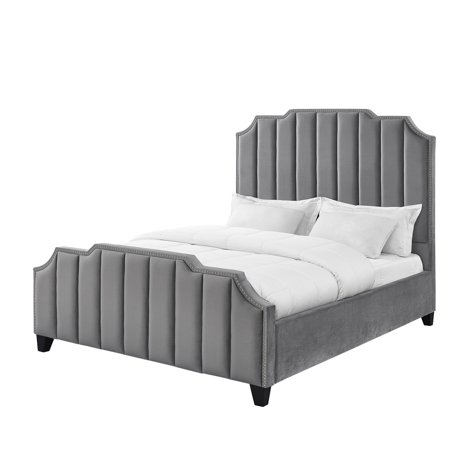 - Features a rectangular panel headboard with nailhead trim and tufted details.