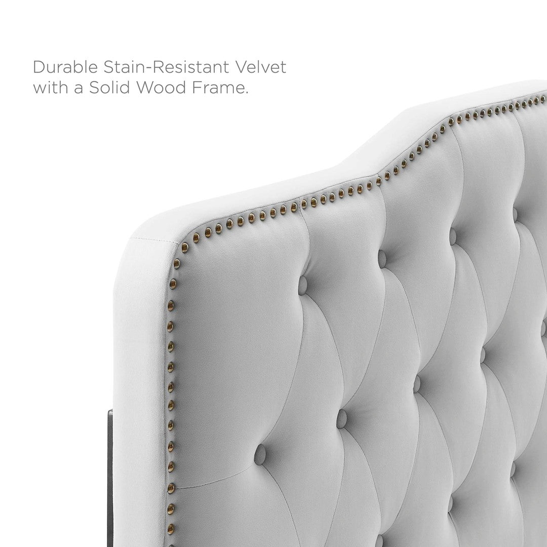 Elevate a child's room or guest space with the Amber Performance Velvet Twin Platform Bed — a vintage-modern statement piece that blends glam deco details with everyday practicality. Plush performance velvet, classic button tufting, and nailhead trim create a polished, inviting look, while a padded headboard and sturdy slat support make this bed both comfortable and reliable for nightly sleep or relaxing with a book.