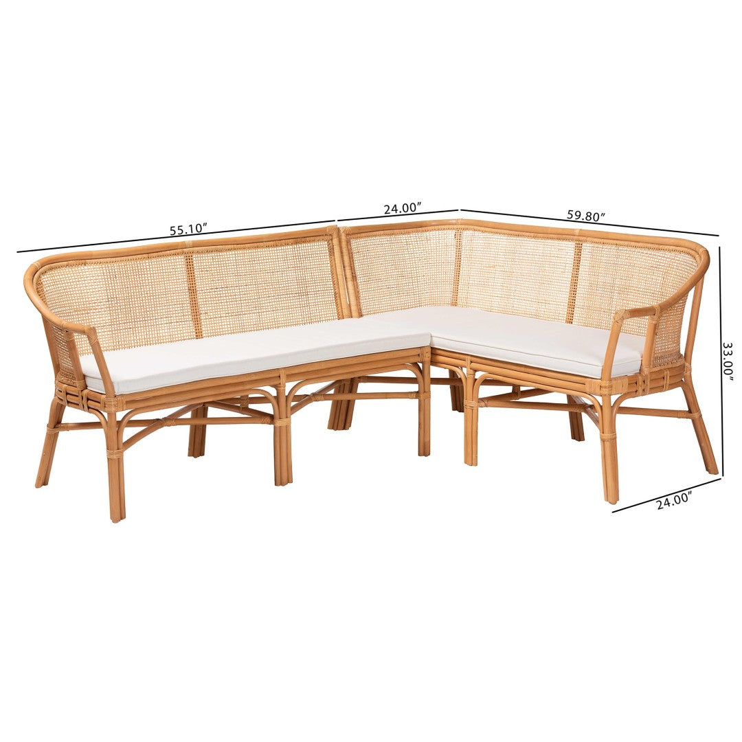 Create a relaxed, boho-coastal dining nook with the Adede 2-piece corner bench set — a handwoven rattan banquette that blends artisanal charm with everyday comfort. Crafted in Indonesia from sustainably sourced natural rattan, this L-shaped set brings warm texture and breezy style to kitchens, sunrooms, or casual dining areas. The lattice backrests and sloping armrests give an inviting silhouette while removable, foam-padded cushions ensure comfortable seating for meals or lounging. Arriving fully assembled, the Adede set is ready to create a cozy corner with enduring character.