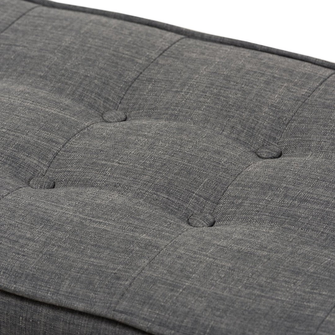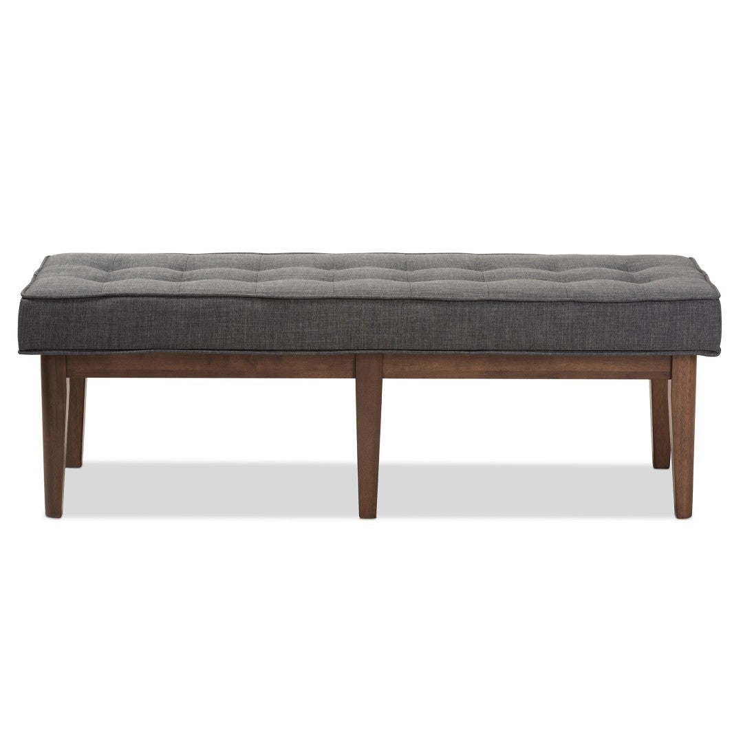 Add a touch of mid-century modern elegance to your dining room, entryway, or living space with this button-tufted bench that blends vintage-inspired details and contemporary functionality. The Lucca bench features a streamlined dark walnut frame and plush dark grey upholstery for a refined, versatile look. Built with a solid rubberwood frame and a generously padded polyester seat, it delivers both durability and comfort for everyday use.