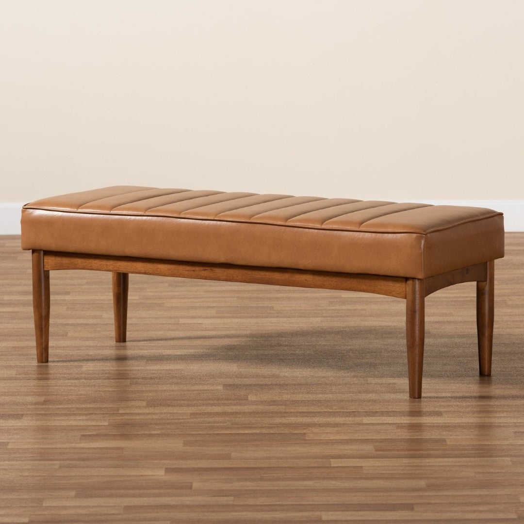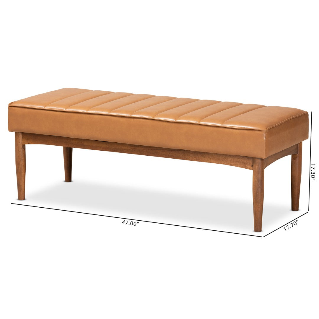 Refresh your dining space with the Daymond bench’s mid-century modern charm — a compact, comfortable seating solution that blends walnut wood tones with tan faux leather upholstery. Plush foam padding and sleek channel tufting create a polished look and cozy feel, while tapered, angled legs add sculptural character ideal for contemporary or retro-inspired interiors.