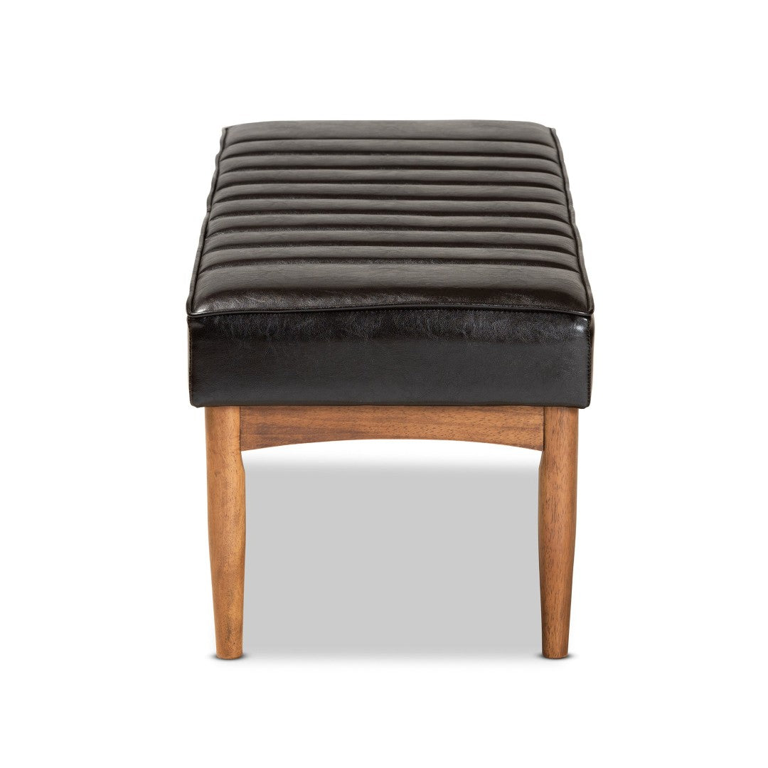 Refresh your dining space with the Daymond bench — a mid-century modern piece that blends clean lines, plush comfort, and warm walnut tones. Upholstered in rich dark brown faux leather and padded with foam, this bench offers a stylish, comfortable seating solution for dining rooms, breakfast nooks, or entryways. Its channel tufting and angled tapered legs deliver a timeless silhouette that complements contemporary and classic interiors alike.