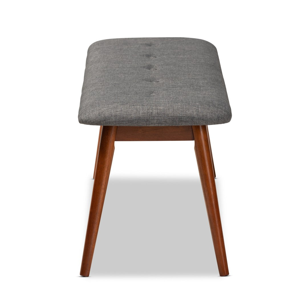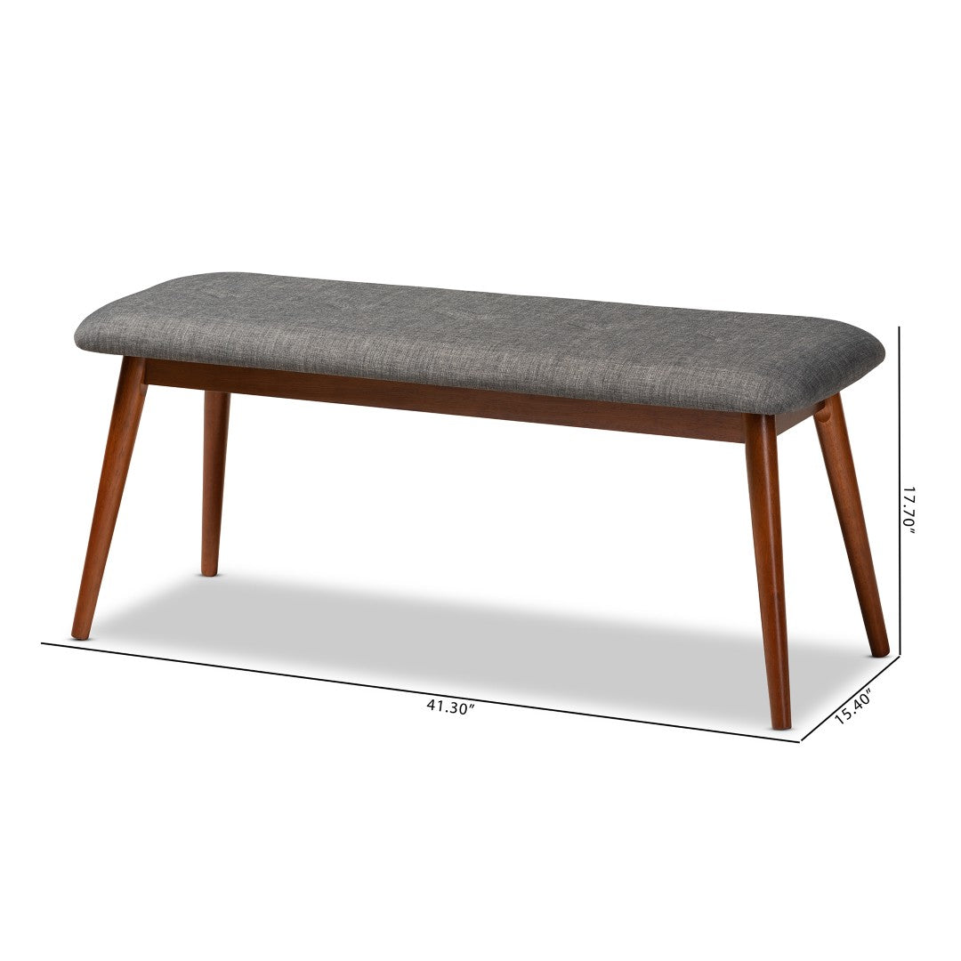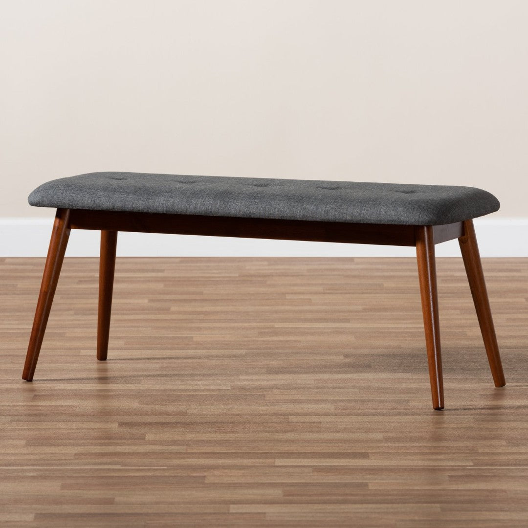 Bring mid-century warmth and refined comfort to your dining room with this Flora II dining bench. Its medium oak finish, tapered angled legs, and subtle button tufting deliver a tasteful, modern silhouette while the foam-padded polyester upholstery ensures comfortable everyday seating. Built from solid rubberwood with careful attention to curved edges and smooth grain, this bench balances durability and style for family meals, entryway seating, or additional dining seating.