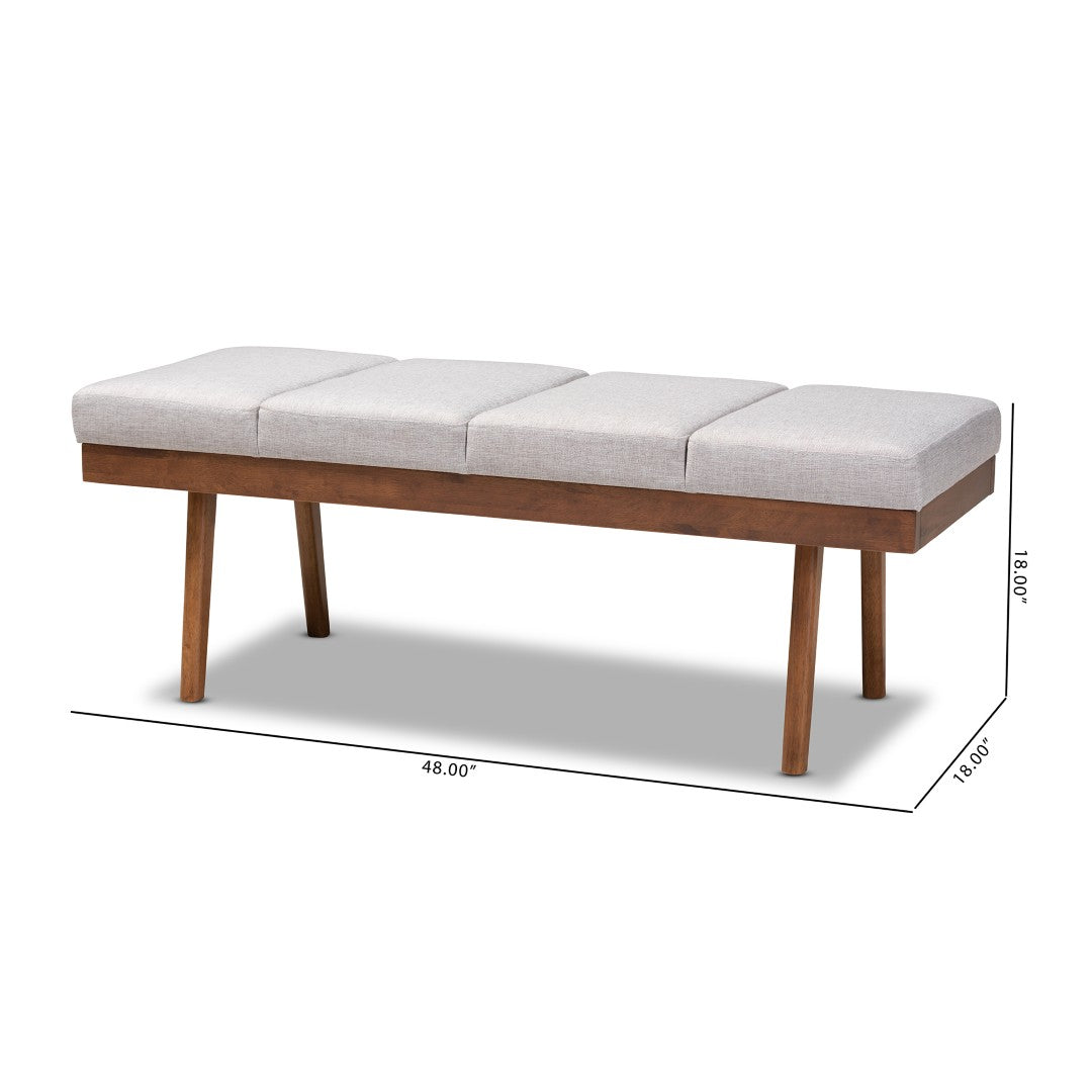 Invite vintage-inspired style and practical comfort into your home with this mid-century modern upholstered wood bench. Thoughtfully designed for entryways, bedrooms, or as an accent at the foot of the bed, it pairs a warm walnut brown wood finish with soft grayish-beige polyester upholstery, plush foam padding, and clean channel tufting for a refined yet relaxed look. The low silhouette and angled, tapered legs deliver classic retro character while remaining sturdy and easy to assemble.