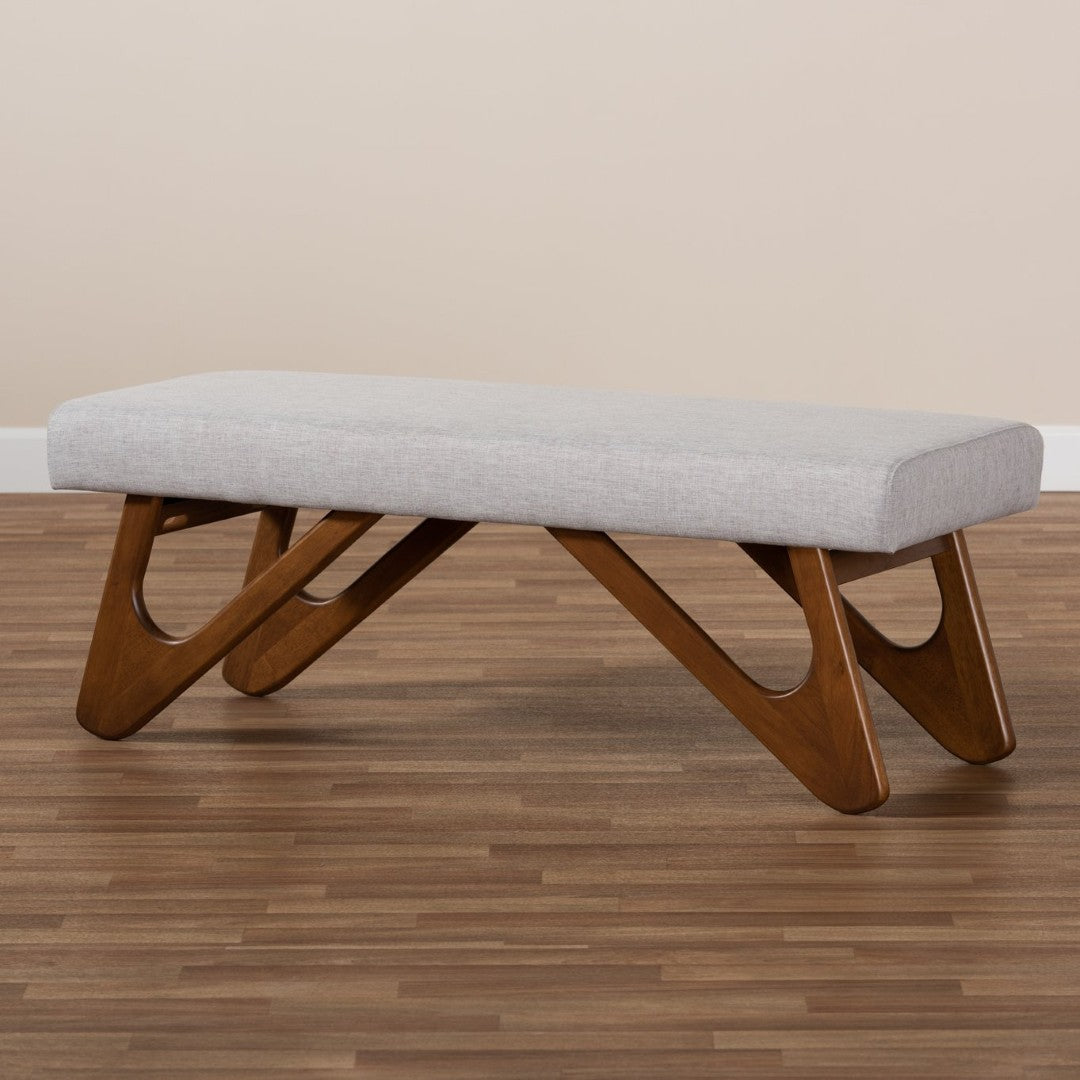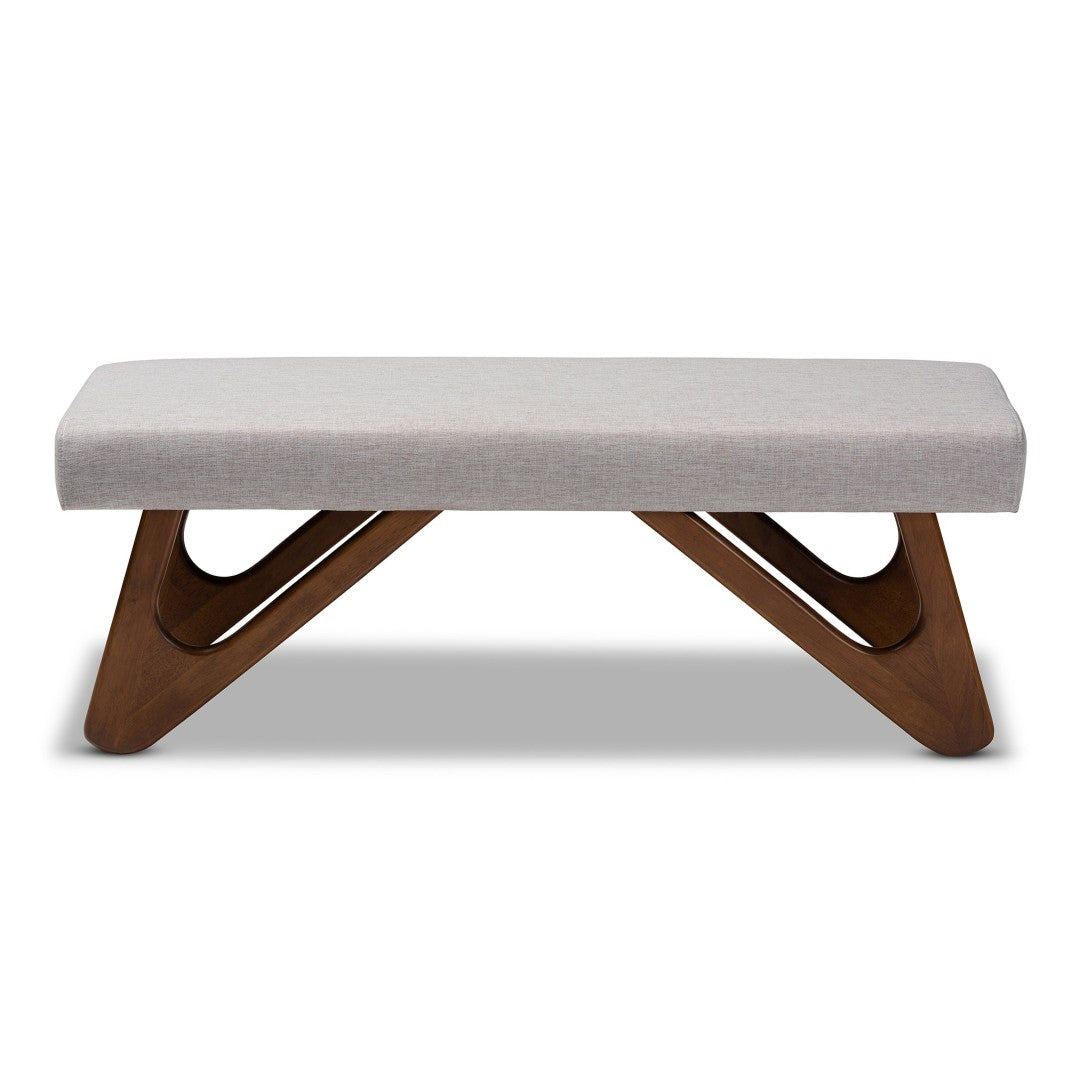 This mid-century modern bench blends retro flair with everyday comfort, making it a stylish and functional addition to entryways, living rooms, or bedrooms. Upholstered in a versatile greyish-beige polyester, the bench pairs plush foam padding with sculptural boomerang-shaped legs finished in warm walnut brown for a refined, sculptural silhouette that elevates any décor.