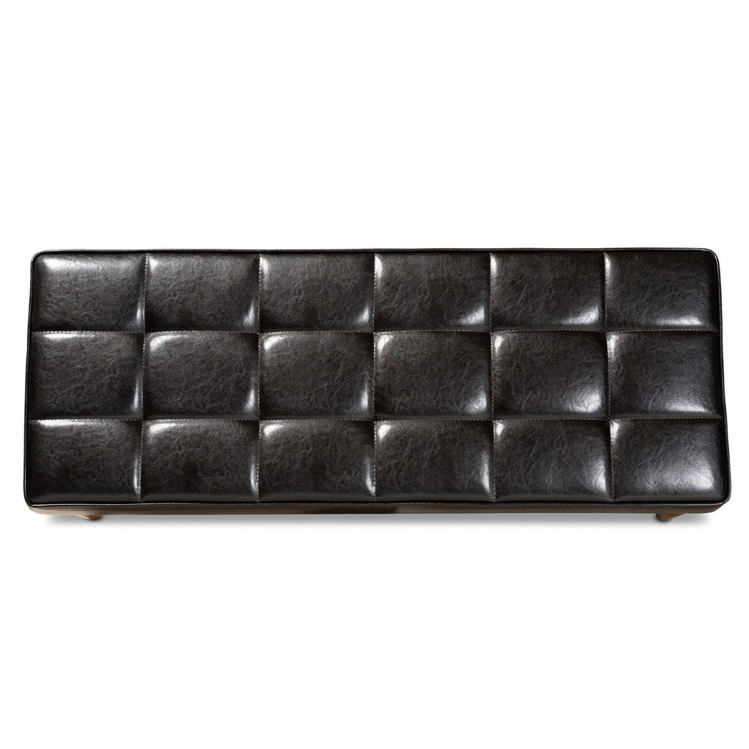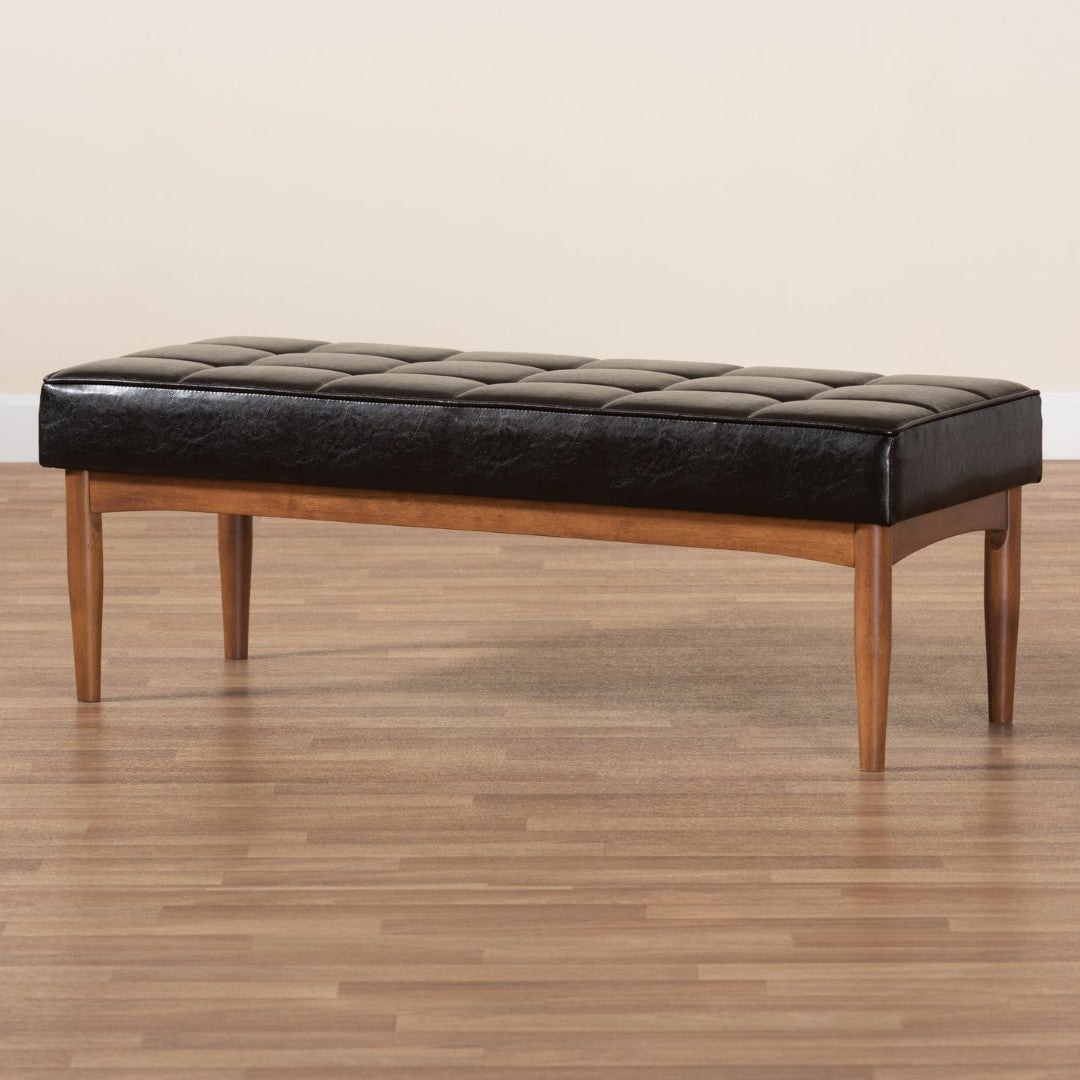 Bring Mid-Century warmth and casual comfort to your dining space with this Sanford dining bench. Its walnut brown finished wood frame and angled, tapered legs create a classic silhouette, while the dark brown faux leather seat—padded with soft foam and detailed with biscuit tufting—offers durable, comfortable seating that suits smaller dining rooms, breakfast nooks, or as stylish extra seating elsewhere in the home.