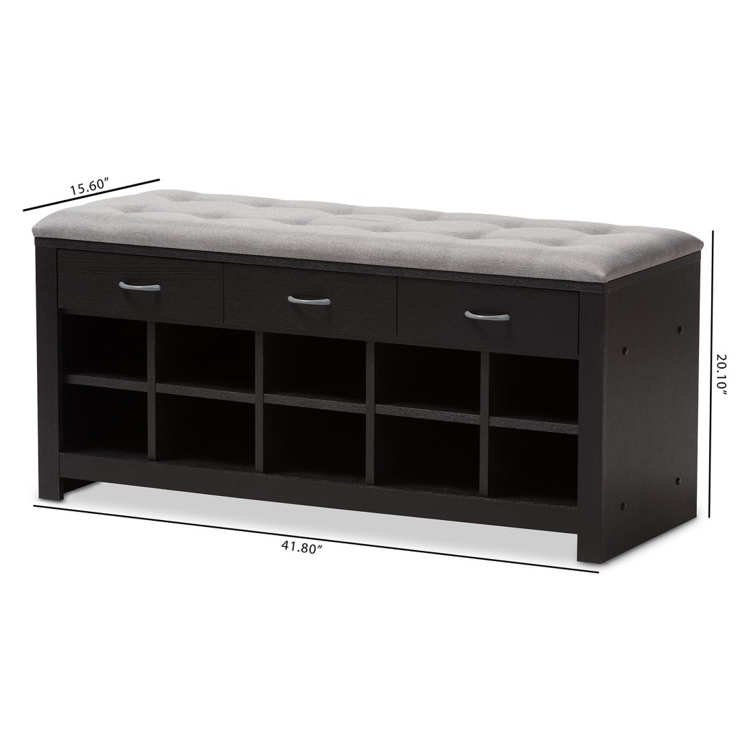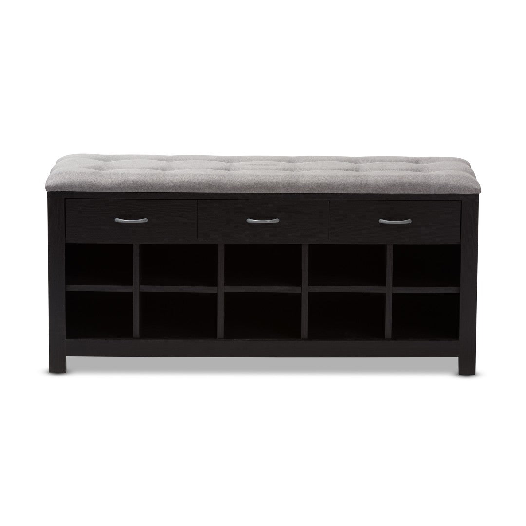Make a welcoming, clutter-free entryway with a stylish bench that combines contemporary design, practical storage, and comfortable seating. This espresso-finished piece features a gray fabric-upholstered, foam-padded seat and thoughtful organization options to keep shoes and daily essentials neatly stored and within reach.