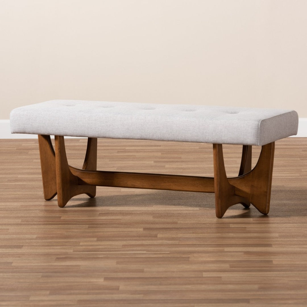 Elevate your entryway, living room, or bedroom with the Theo bench — a mid-century modern accent that blends sculptural form with everyday comfort. Its soft grey-beige upholstery, tailored button tufting, and distinctive interlocking walnut-finished base create a refined focal point that’s both stylish and functional.
