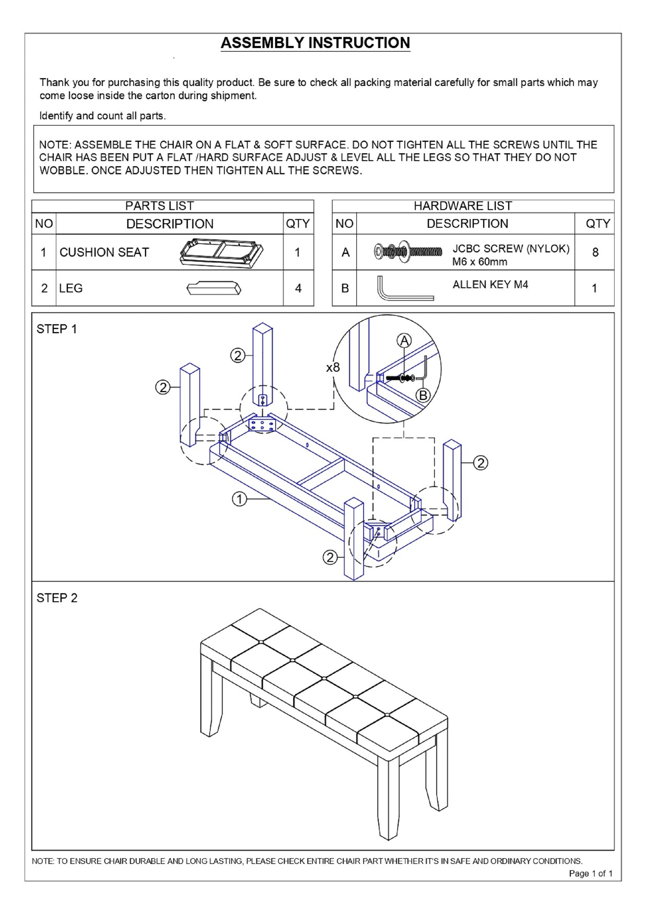 - Included: 1 bench. Simple assembly required (leg attachment).