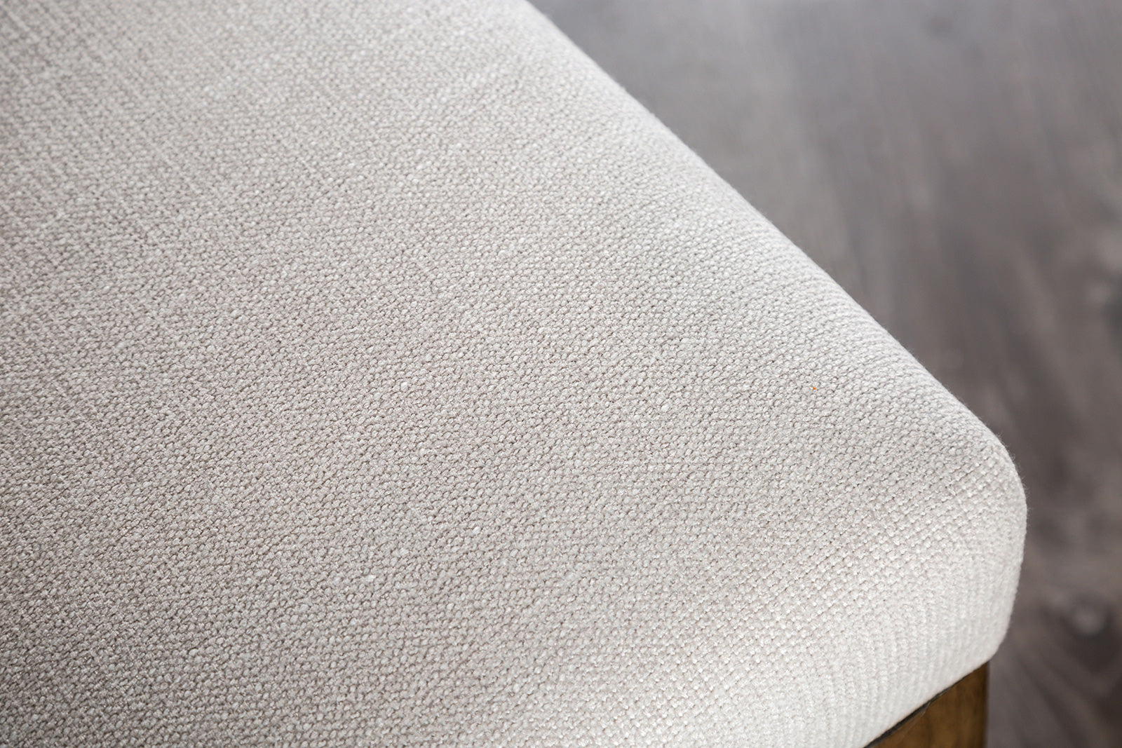 - Comfortable fabric-upholstered seat designed for long bench seating alongside or beside a dining table.