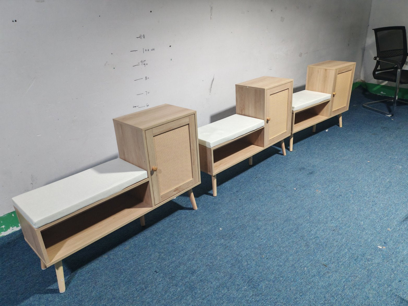 Keep shoes, bags, and daily essentials neatly organized while adding a warm, natural accent to your entryway or bedroom. This 2-in-1 shoe storage bench combines a roomy shoe cabinet and a comfortable seating surface, offering practical organization without sacrificing style. Built with a sturdy frame and faux rattan panels, it delivers a modern, textured look and includes a removable, washable cushion for comfortable put-on and take-off moments.