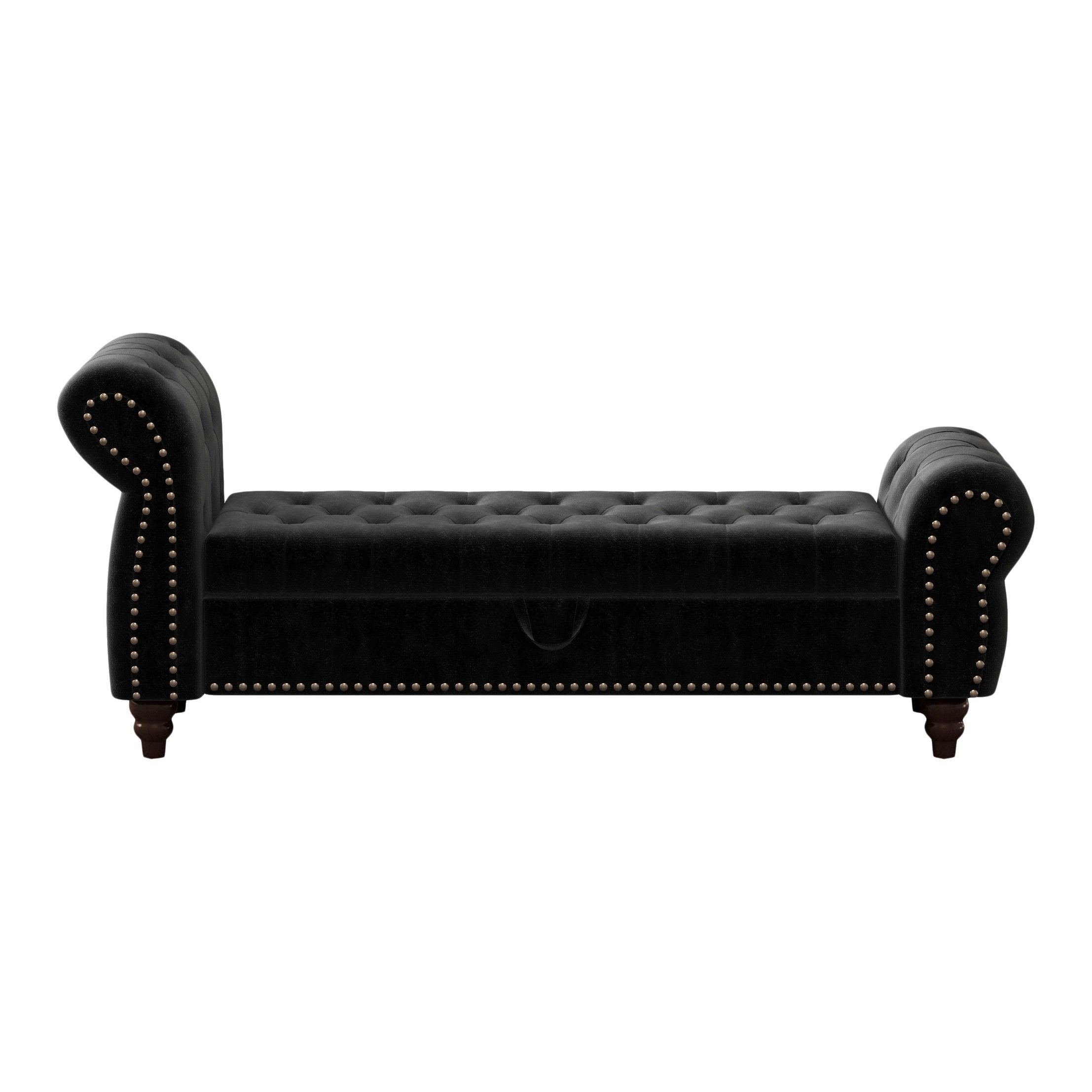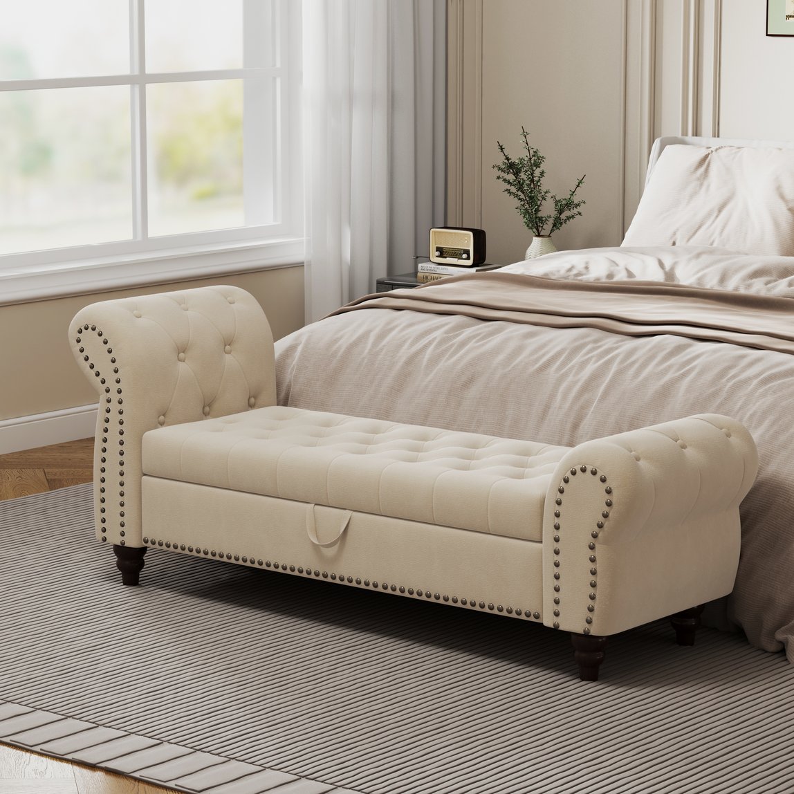 Add a touch of classic elegance and practical storage to your bedroom or sitting area with this tufted chaise-style bed bench. Upholstered in soft beige velvet and supported by a solid wood frame, it blends comfortable seating with a refined silhouette and hidden storage—ideal for extra blankets, pillows, or seasonal items.