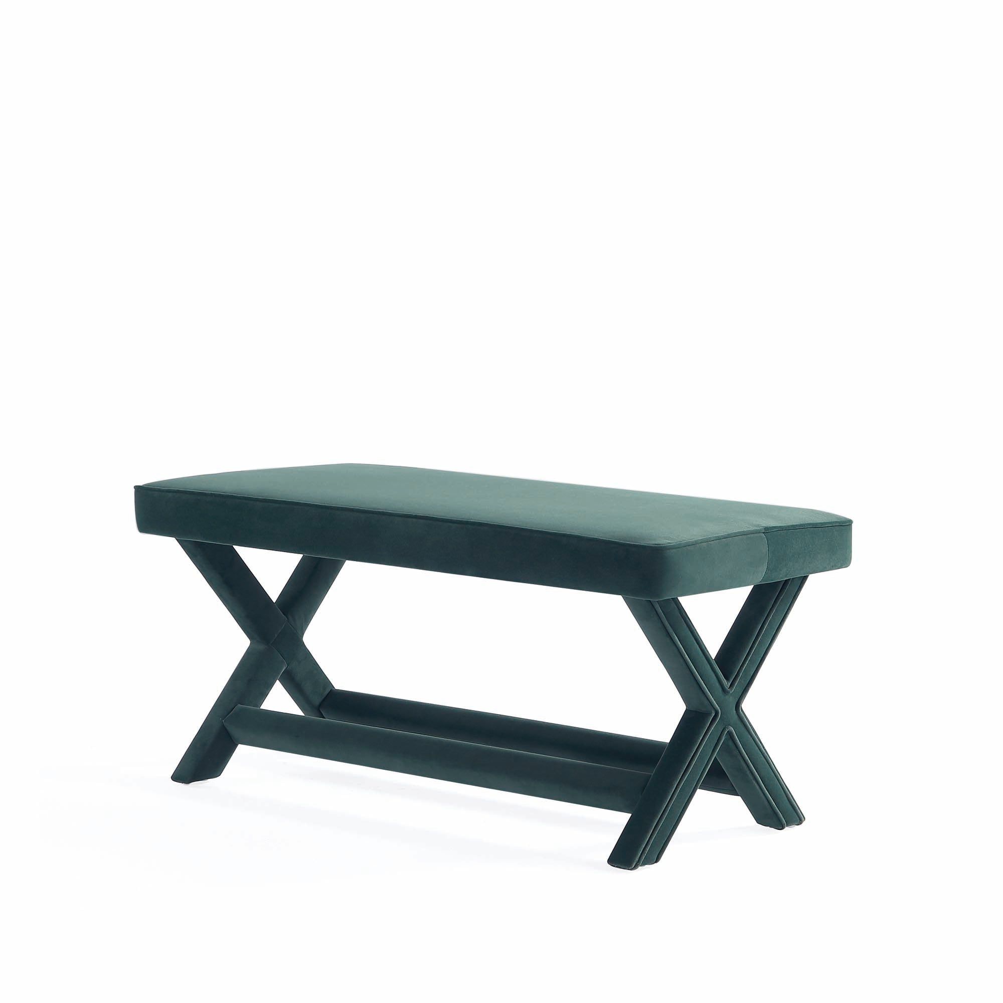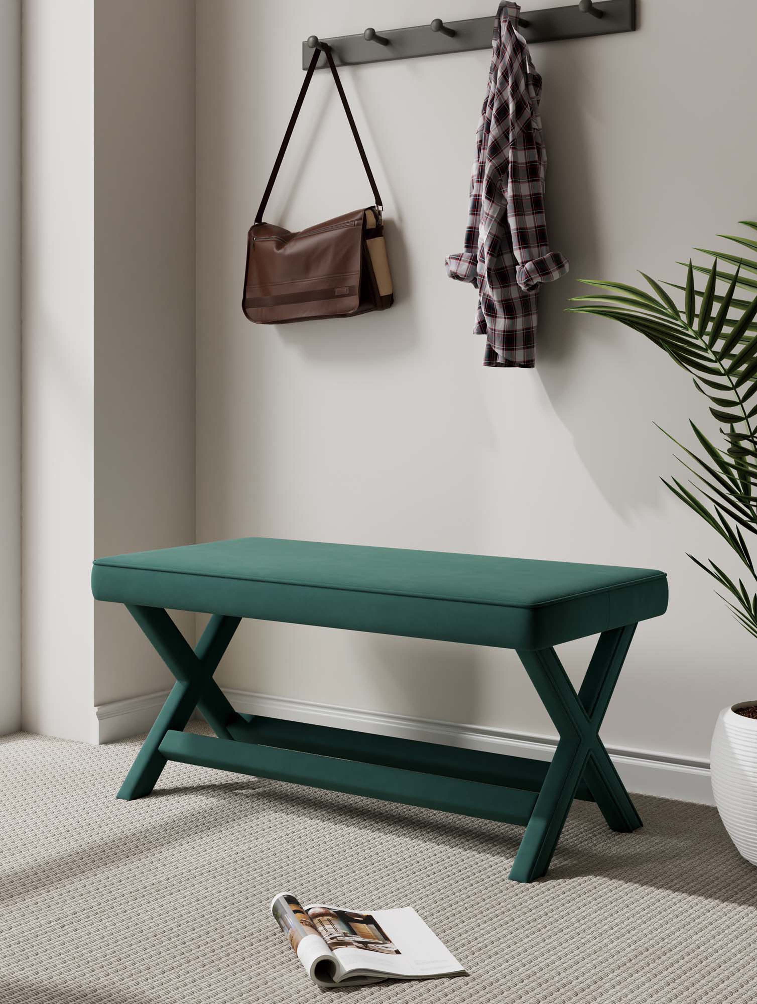 Bring a touch of timeless elegance and cozy comfort to your entryway, bedroom, or living room with this Abigail upholstered velvet accent bench in forest green. Designed with a durable solid wood frame and plush piped cushion, it blends refined styling with everyday functionality—perfect as extra seating, a dressing bench, or a decorative focal point.