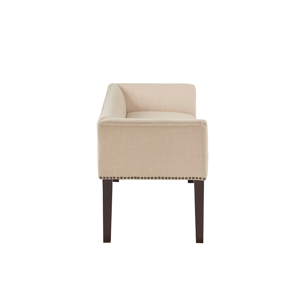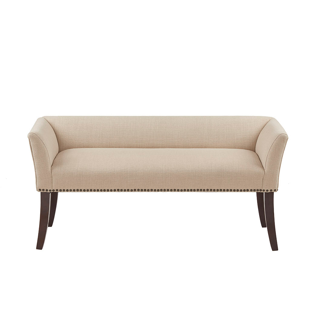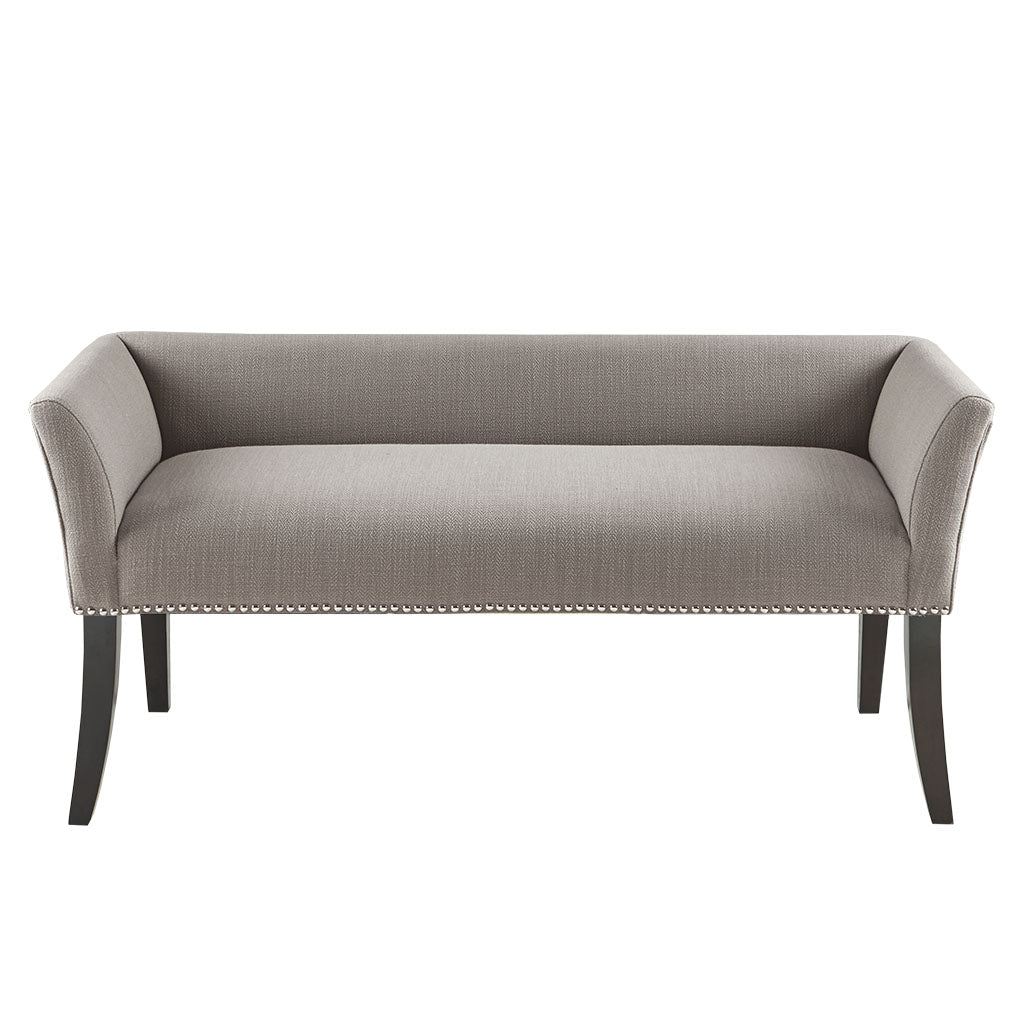 Elevate your entryway, bedroom, or living room with the Madison Park Welburn Accent Bench — a refined, versatile piece that blends contemporary lines with classic details. Upholstered in a soft grey polyester-linen blend, the bench pairs a low back and gently flared arms with subtle sliver nailhead trim and a light Morroco wood finish for a polished, transitional look. Comfortable foam cushioning and a solid wood frame deliver reliable support and long-lasting use. Assembly required.