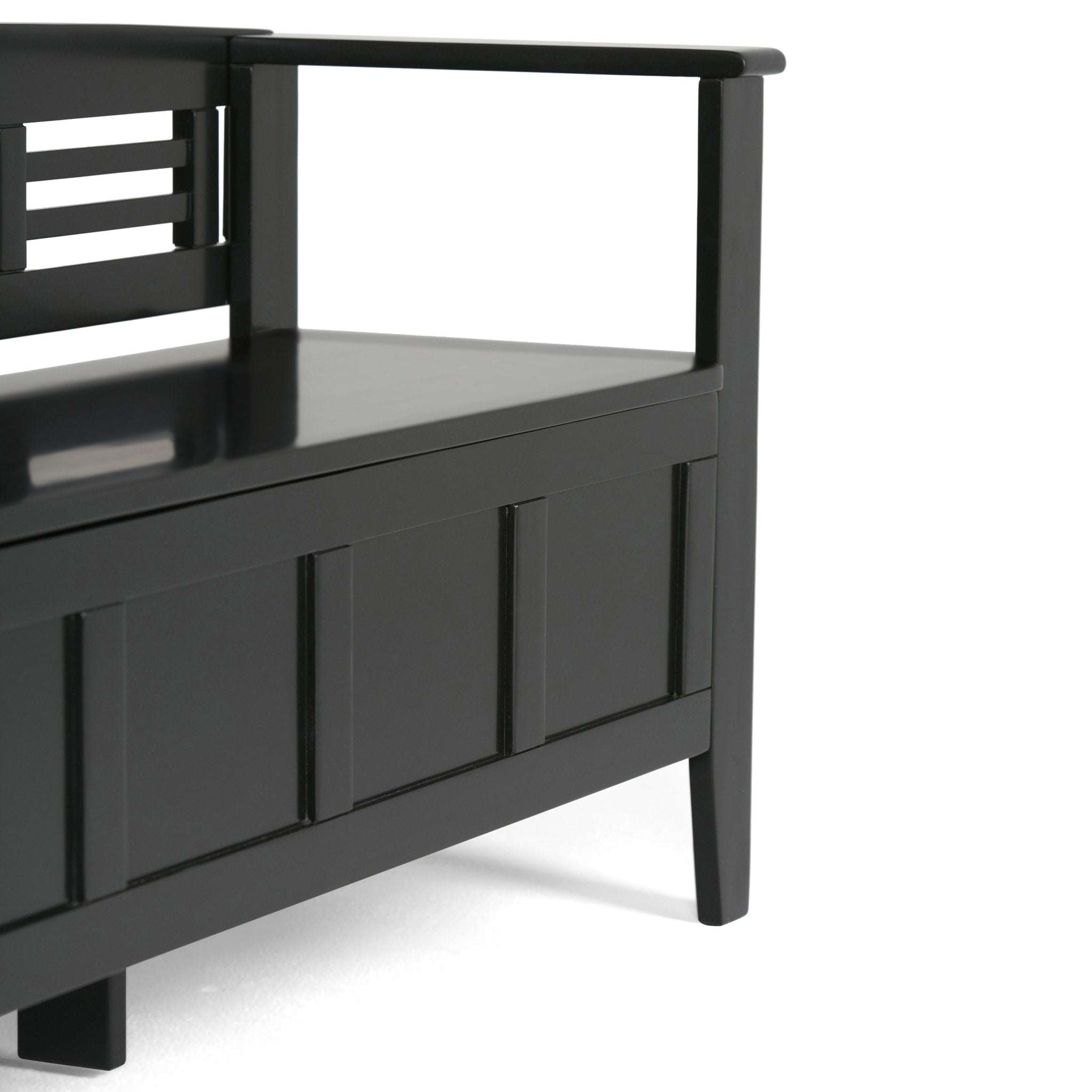 Give your entryway an instant upgrade with the Adams Entryway Storage Bench in Black — a handcrafted, multifunctional piece that blends classic shaker styling with contemporary simplicity. Built from solid wood and finished in a protective black lacquer, this bench provides comfortable seating for two plus generous hidden storage to keep shoes, scarves, and seasonal items neatly tucked away.
