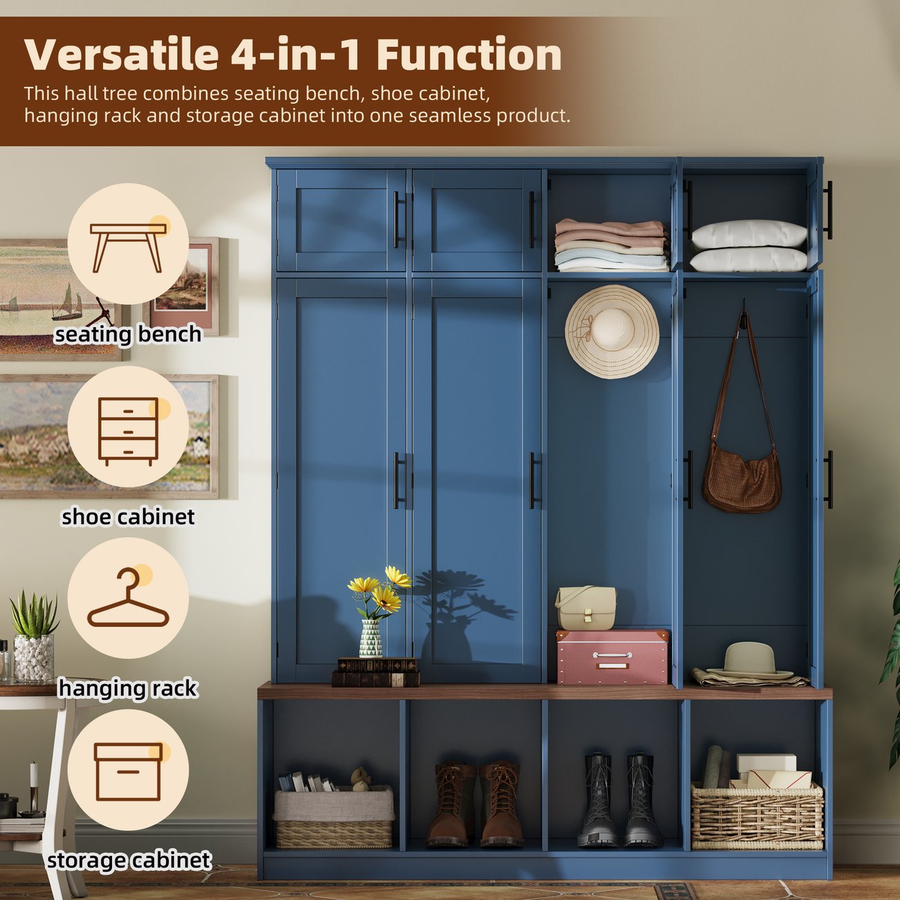 - Versatile 4-in-1 Function: This hall tree combines seating bench, shoe cabinet, hanging rack and storage cabinet into one seamless product. Whether you need a place to store things, or get a place to relax, this entryway cabinet can meet your needs. Its versatile function makes it ideal for use in entryways, mudrooms, living rooms or any other indoor space.