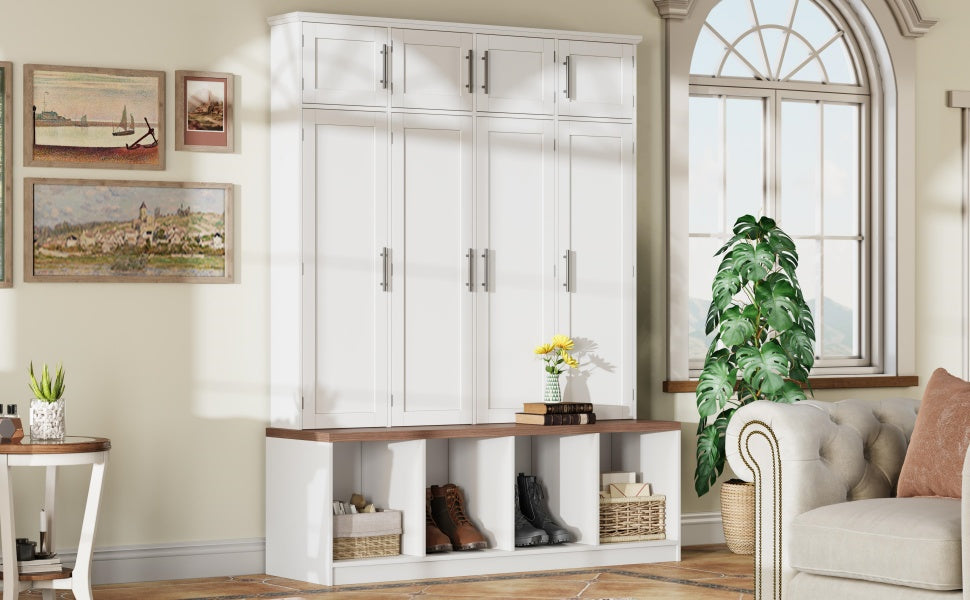 Transform your entryway into a tidy, welcoming space with this multifunctional farmhouse hall tree. Combining a warm walnut bench with a white storage cabinet and hidden hooks, it provides organized shoe storage, seating, and a neat hanging solution—all in one compact unit. Designed for everyday use, it blends farmhouse charm with modern practicality to suit entryways, mudrooms, and living areas.