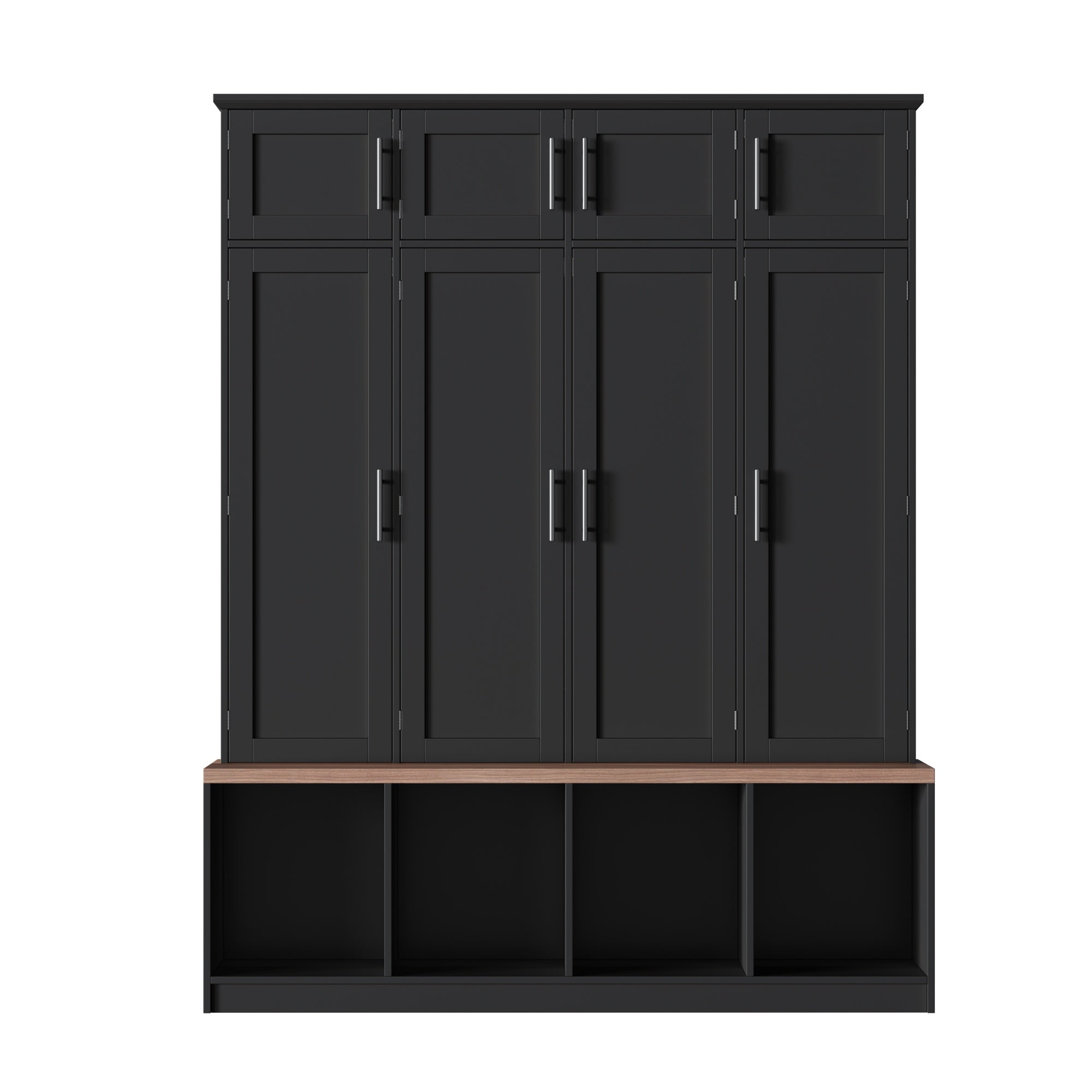 - Ample storage: 8 cabinet doors plus 4 open bottom compartments for shoes, bags, hats, and other accessories to keep surfaces tidy.