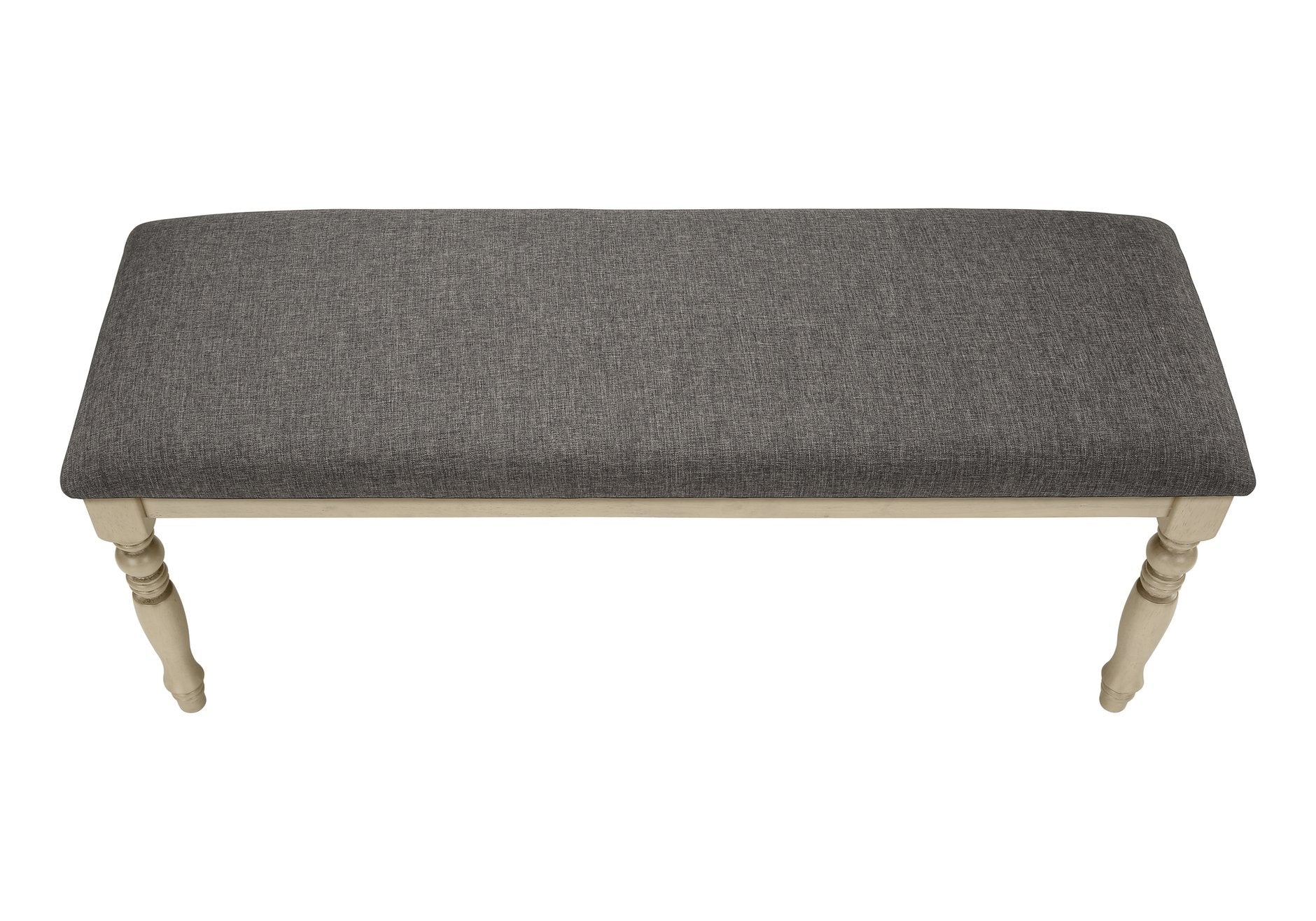 Elevate your entryway, dining area, or kitchen with this transitional upholstered bench that blends classic charm and modern comfort. Finished in antique grey with a dark grey fabric seat and turned solid wood legs, it offers stylish seating for family meals, casual gatherings, or as a functional accent piece in a hallway.