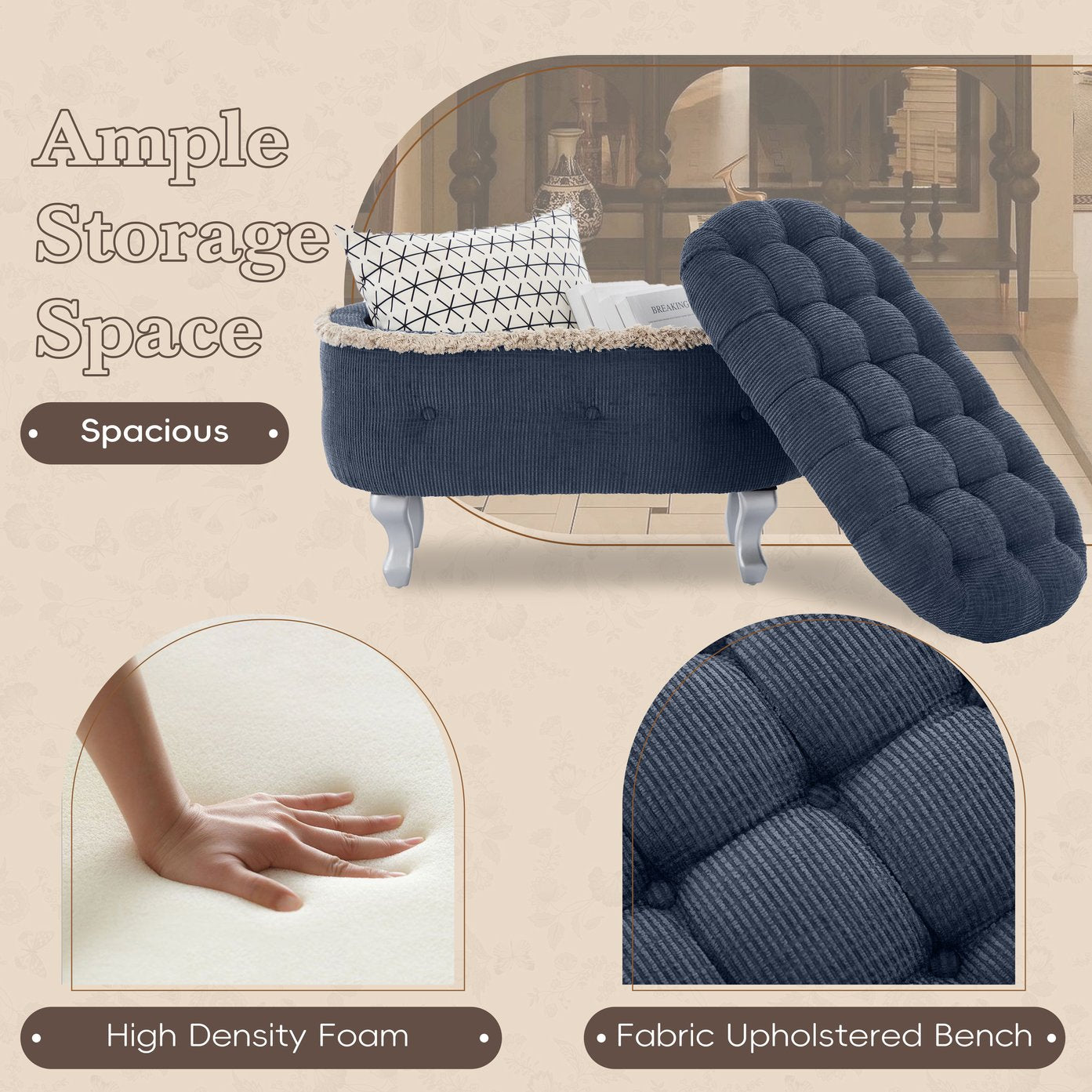 Add a touch of vintage elegance and practical storage to your bedroom, entryway, or window seat with this button-tufted upholstered storage bench. Soft, breathable fabric and high-density foam create a comfortable perch while the tassel fringe and curved wood legs give the piece a refined, retro character. Lift the hinged top to reveal generous internal storage that keeps blankets, shoes, magazines, and seasonal items neatly out of sight.