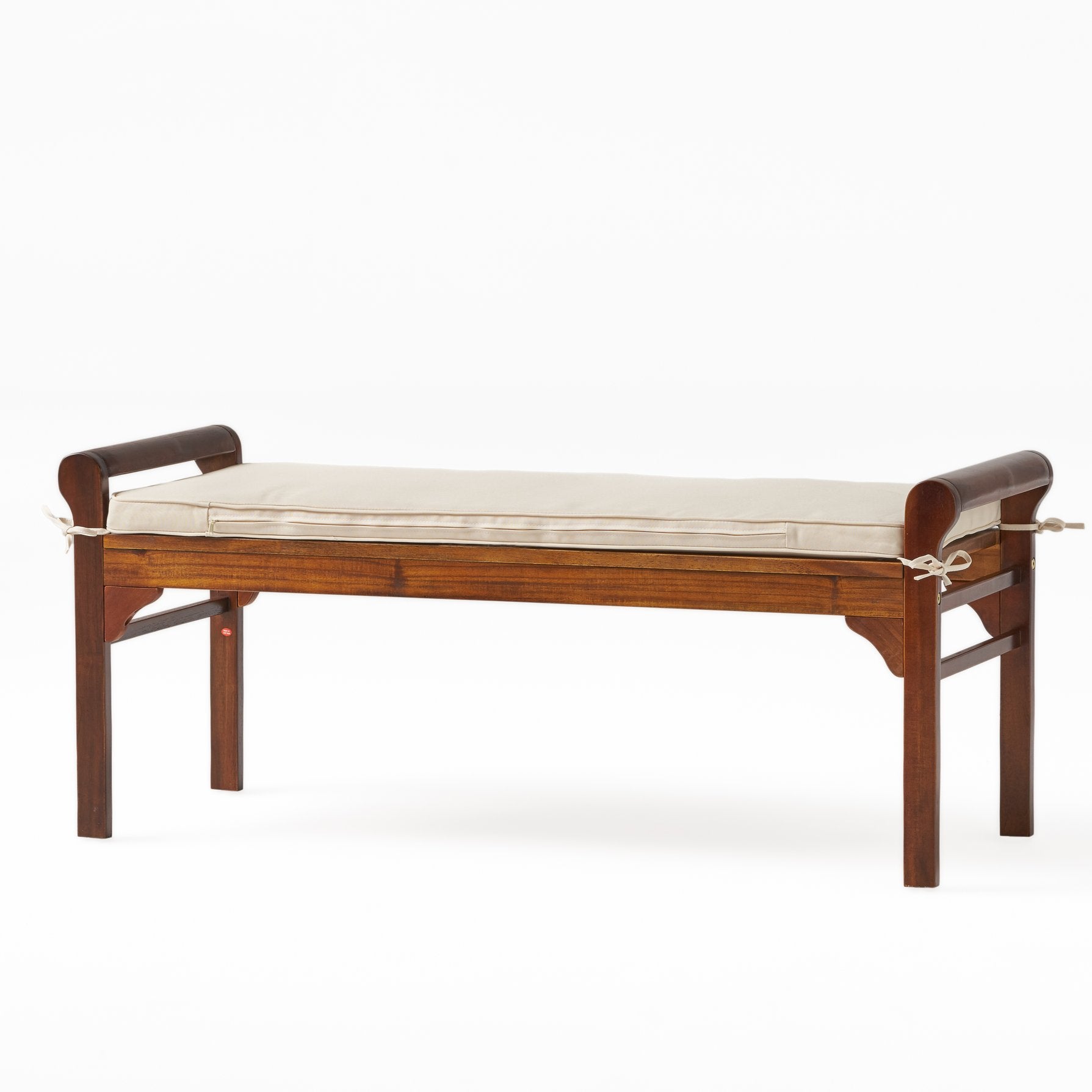 Add a touch of warm, natural charm to any room with this acacia wood bench topped with a comfortable, tied cushion. Its solid hardwood construction and sleek mahogany finish provide lasting durability and style, while the removable cushion offers everyday comfort and easy cleaning. Ideal for entryways, bedrooms, or at the end of a bed, this bench combines function and refined design in a compact footprint.