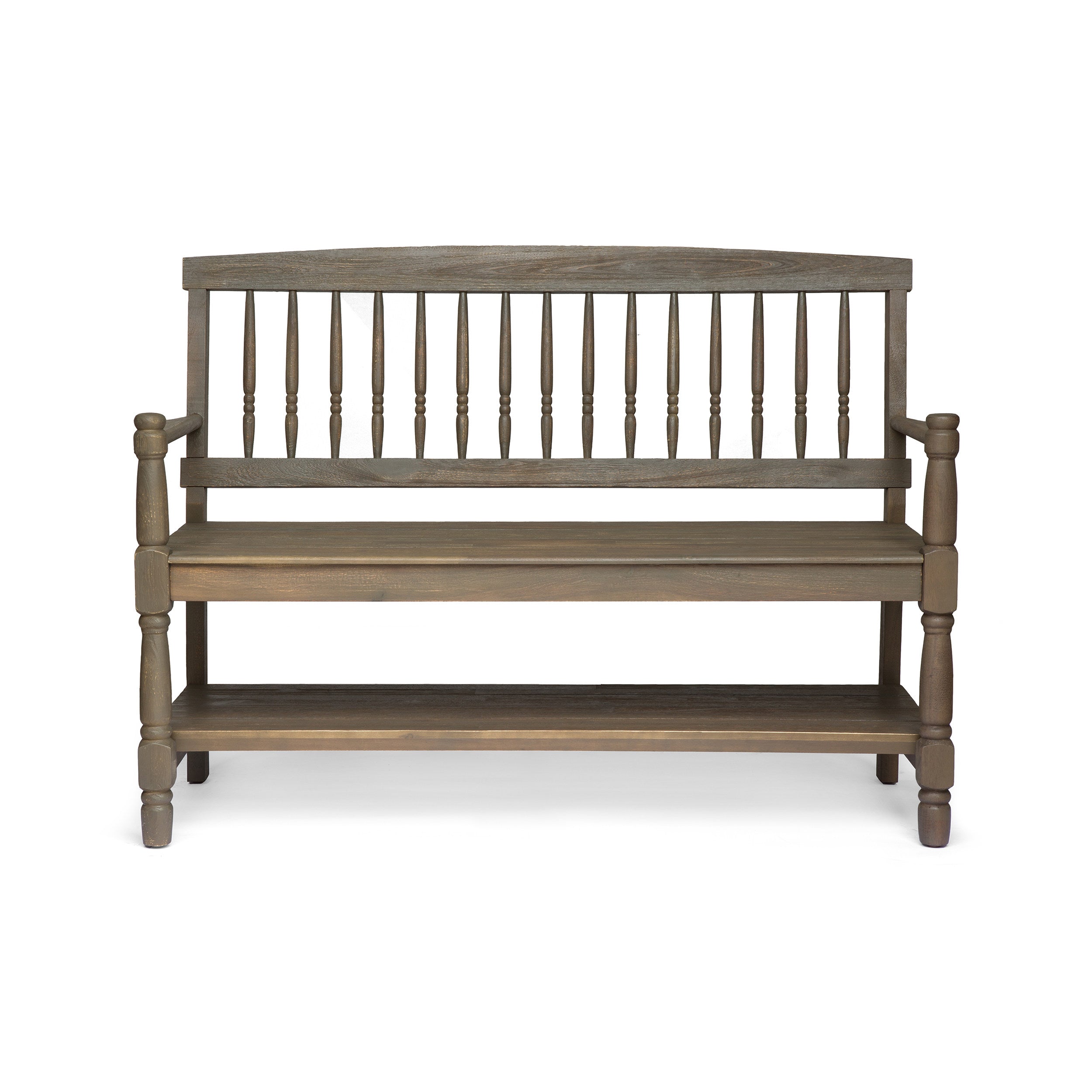 - Classic and timeless, this farmhouse Bench with a built-in shelf will not only add beauty to your home, but also act as a practical, understated means of storing previously cluttered possessions. With delicately carved Acacia wood details and a Sturdy frame, this piece is a gorgeous Sight to behold