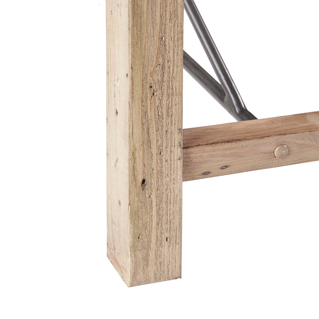 - Materials & Finish: Solid pine wood seat with weathered finish; metal stretchers with gunmetal finish
