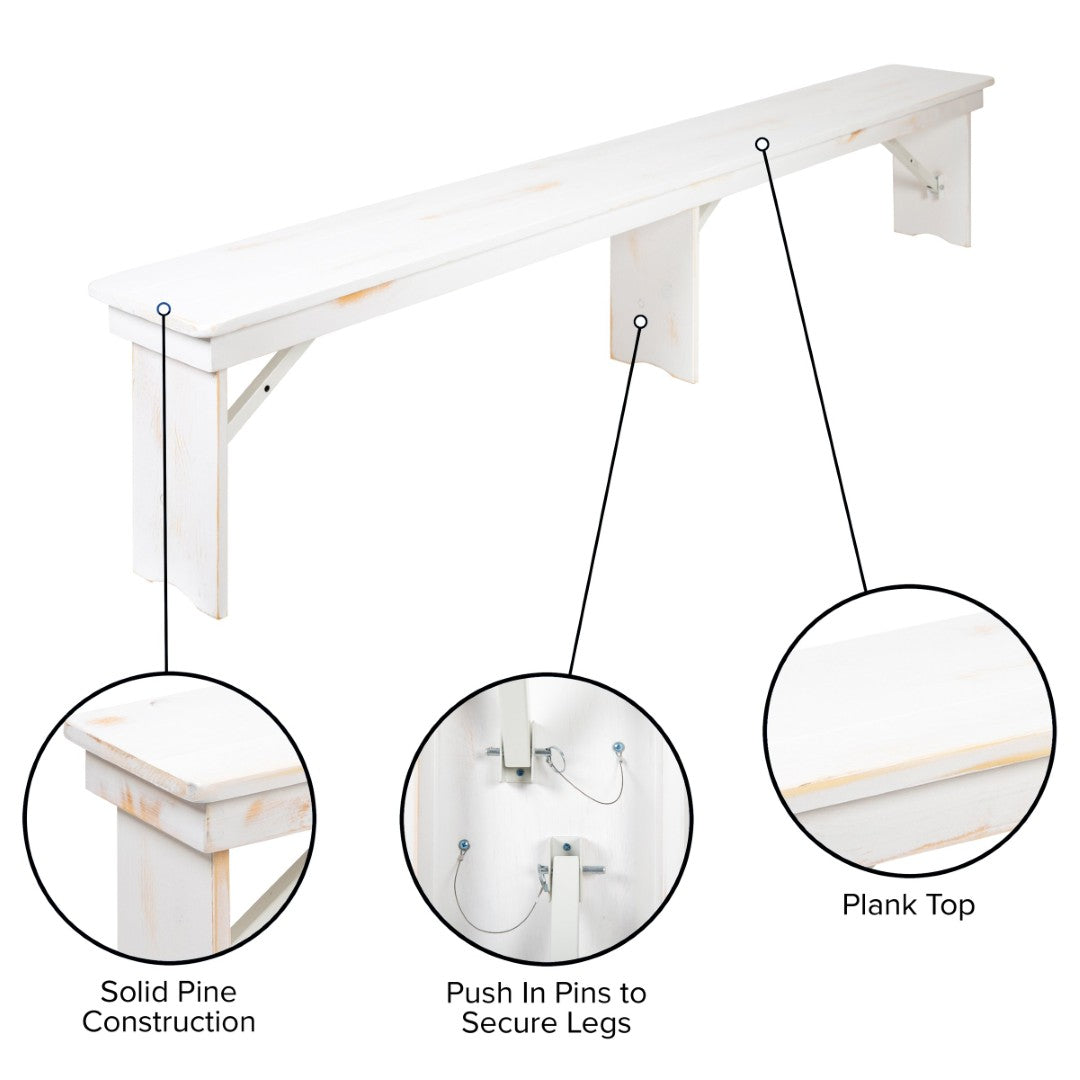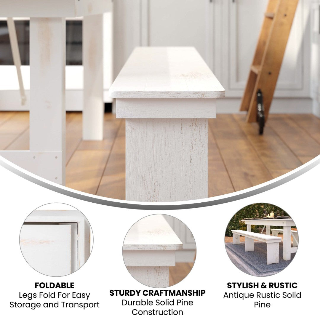 Bring timeless rustic charm and commercial-grade durability to your home or business with this antique-style solid pine farmhouse folding bench. Thoughtfully designed for both aesthetic appeal and practical use, the bench pairs beautifully with farmhouse tables or stands alone in an entryway, while its heavy-duty construction and foldable legs make it ideal for restaurants, cafes, events, and occasional outdoor use.