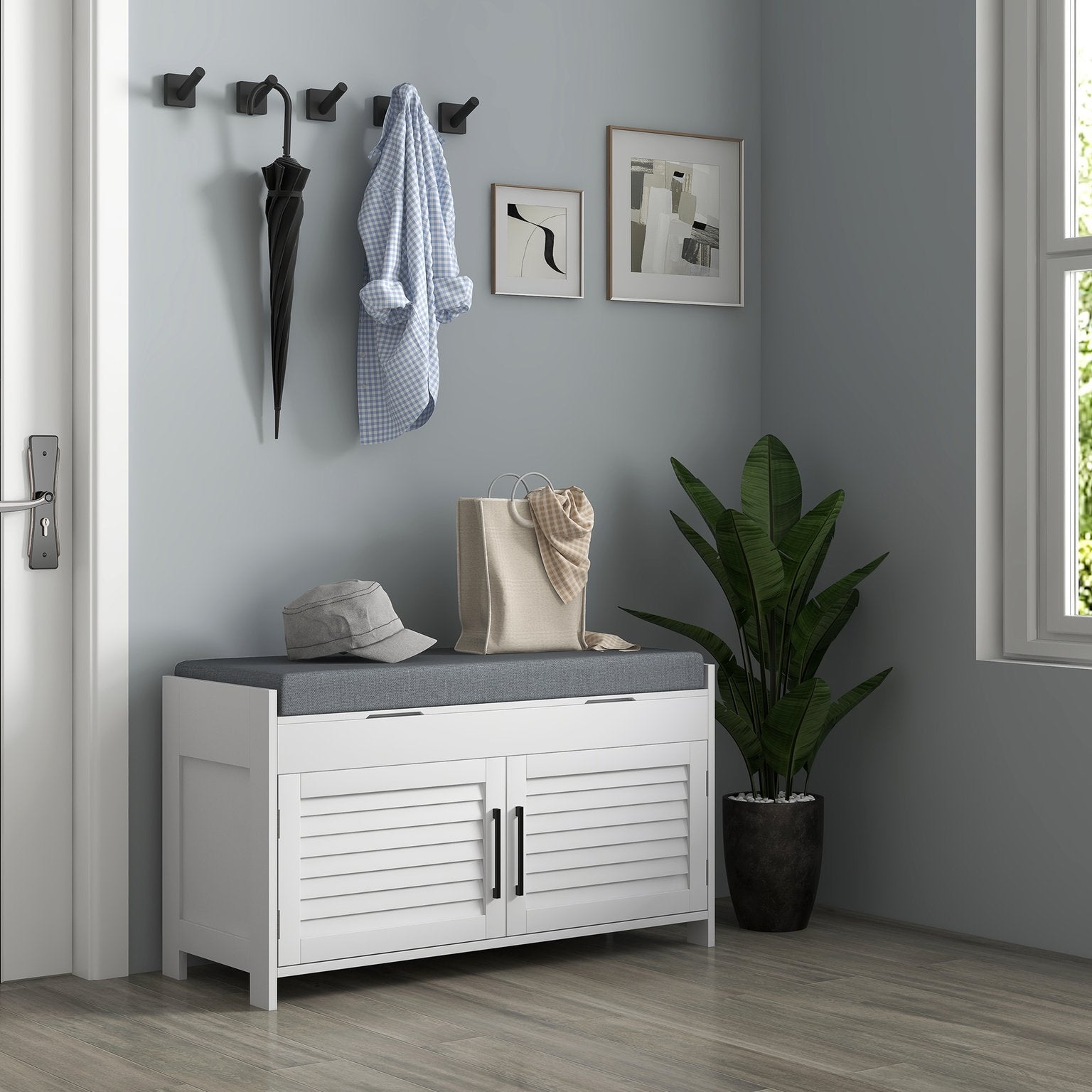 - Shutter Doors: This shoe rack bench has a modern, charming look while still allowing for ventilation. Use it in the living room, entryway, and bedroom.