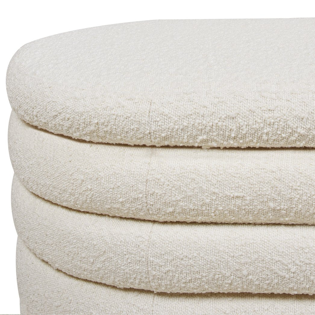 Elevate your entryway, bedroom, or living space with this sleek upholstered oval storage bench. Its plush boucle upholstery and clean Mid-Century Modern-inspired lines provide both texture and timeless style, while the hidden storage compartment keeps blankets, shoes, and essentials neatly out of sight. Arrives fully assembled for immediate use.