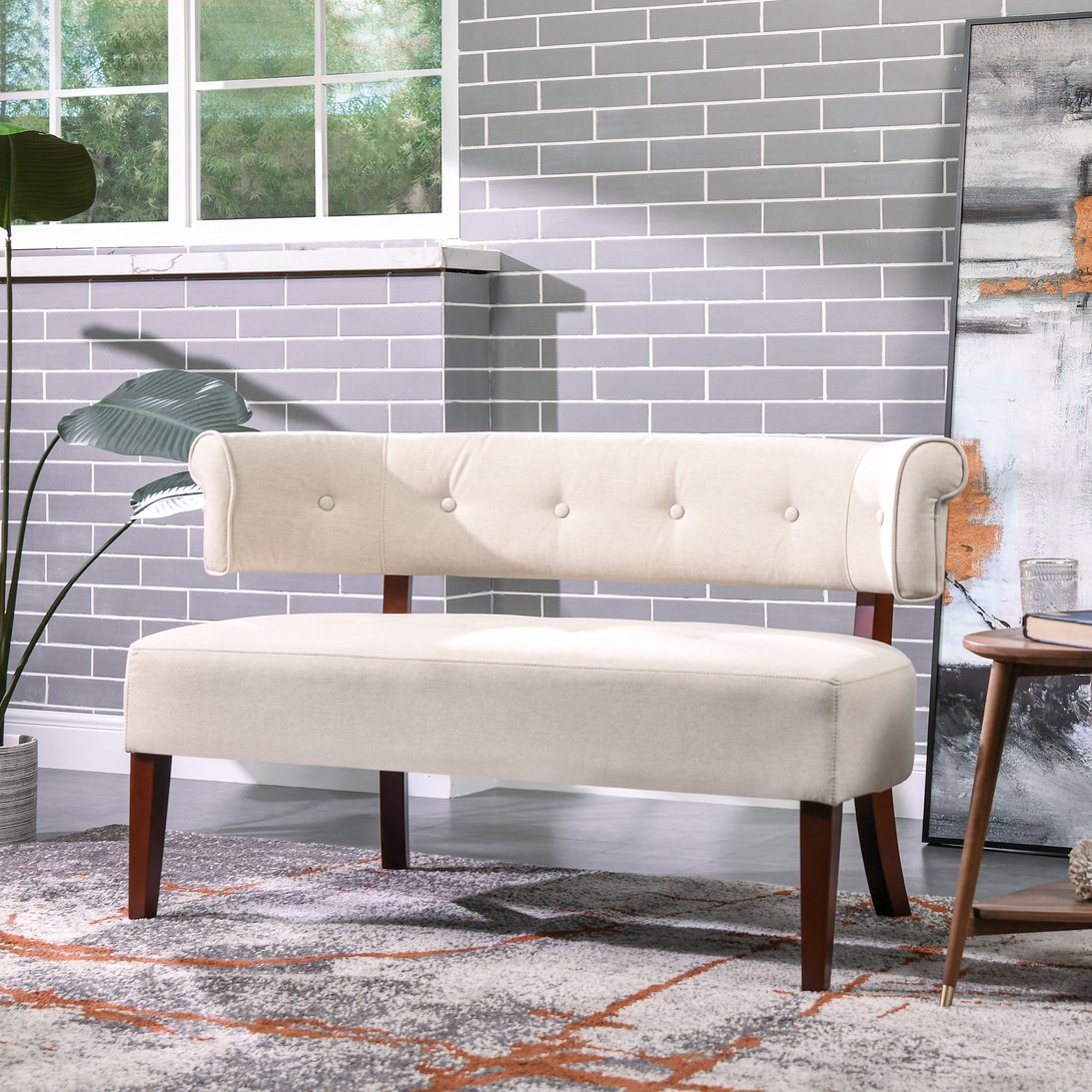 Elevate your entryway, bedroom, or dining nook with the Jared Roll Arm Tufted Bench Settee — a refined blend of Mid-Century Modern styling and lasting comfort. Upholstered in a soft Sky Neutral Beige polyester, this compact settee offers a stylish seating solution that’s both functional and elegantly tailored, featuring tufted detailing and recessed roll arms that complement a variety of interiors.